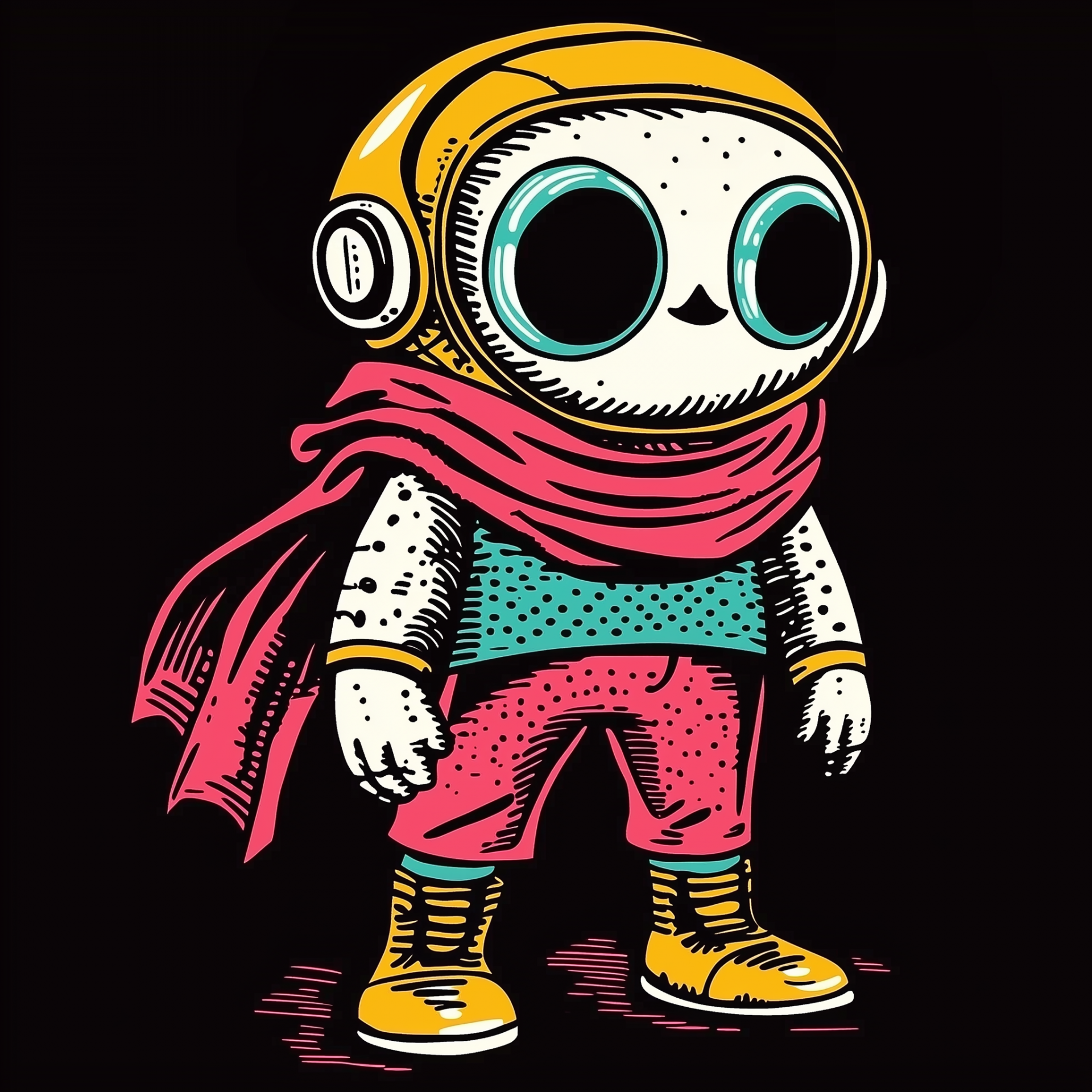 This illustration features a full body anthropomorphic marshmallow character with a cute white face, striking a superhero pose. The character is adorned with headphones and a futuristic costume, set against a plain black background, creating a striking visual impact.
