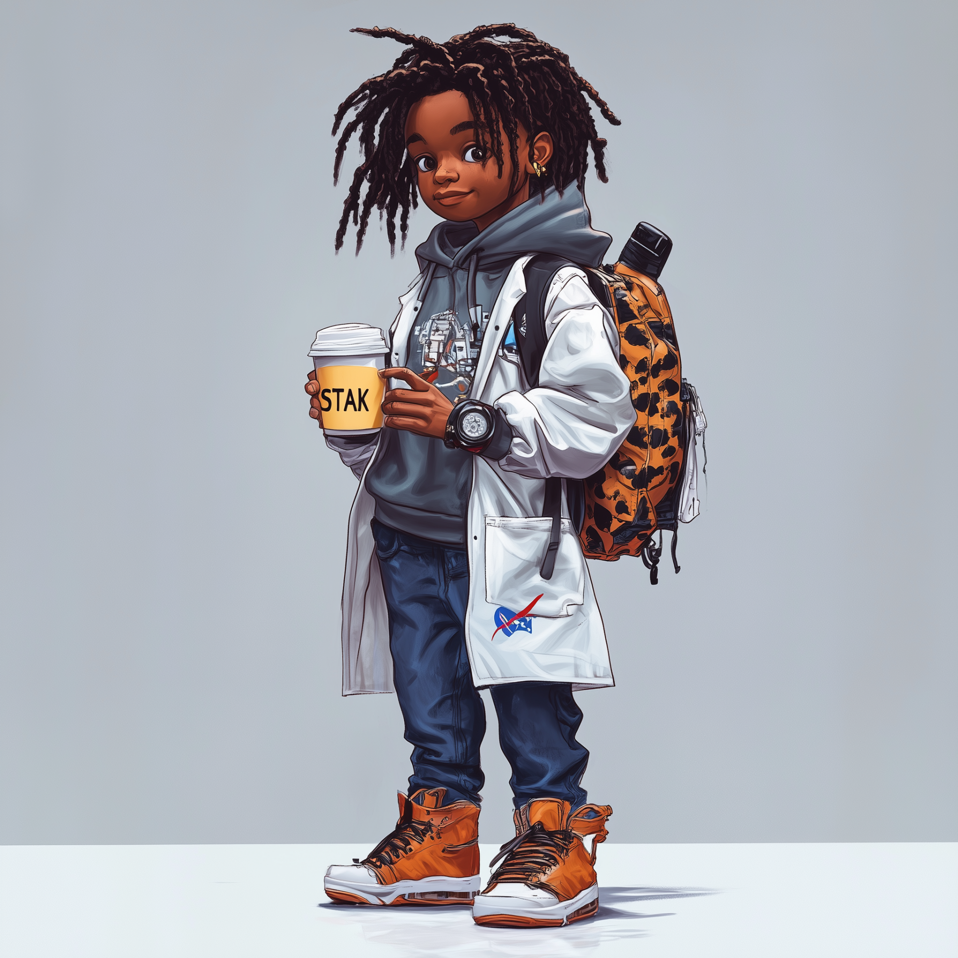 A young boy stands confidently in a vibrant science lab, highlighting his cool demeanor with a NASA lab coat and trendy sneakers. He appears focused and thoughtful while holding a cup that promotes creativity in science education for his community.