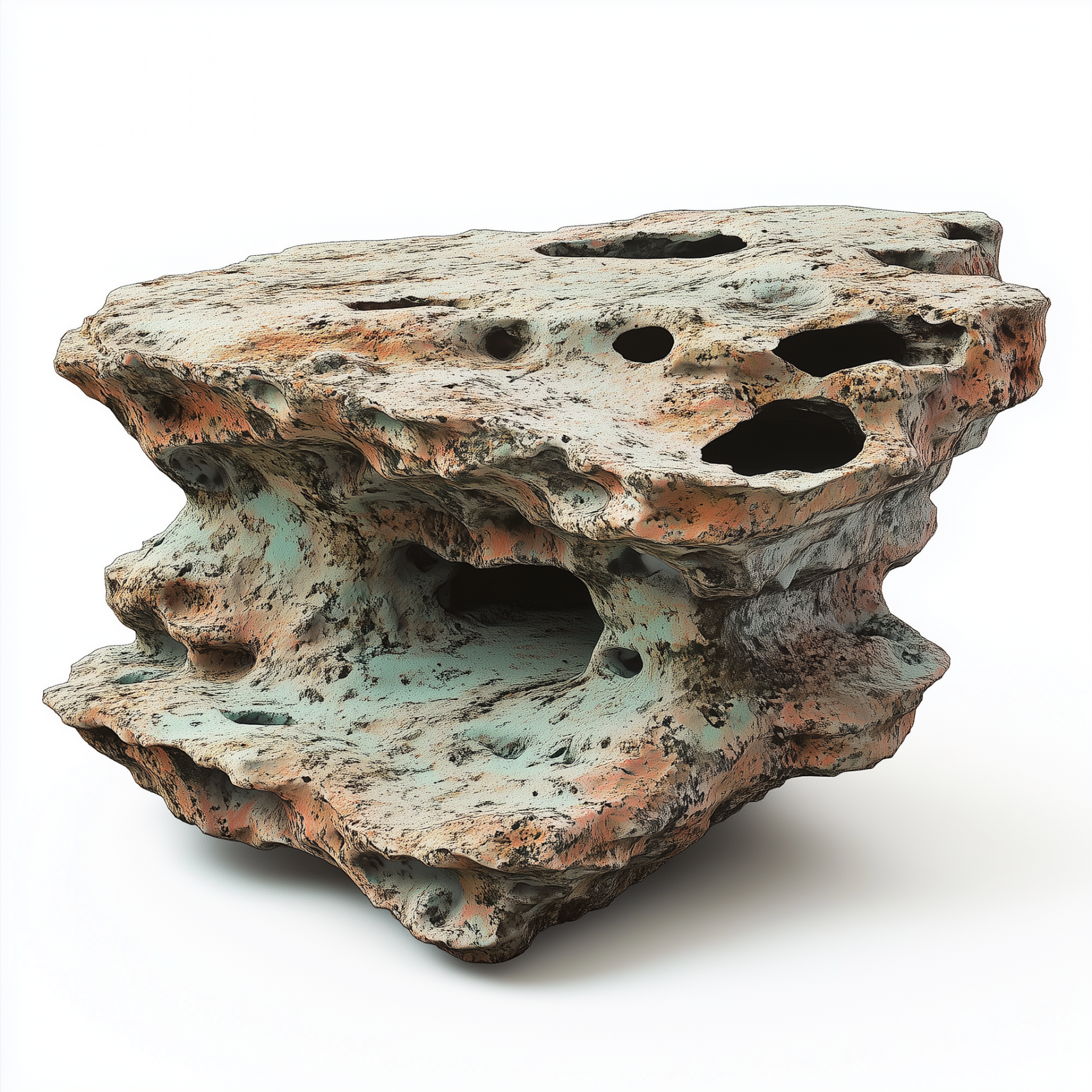 The image showcases a detailed 3D model of a coral rock ledge, featuring multiple holes and textures that create a realistic underwater atmosphere. The surface is adorned with vibrant sea algae and the ledge layers descend into a white background, enhancing the structure's depth and complexity.