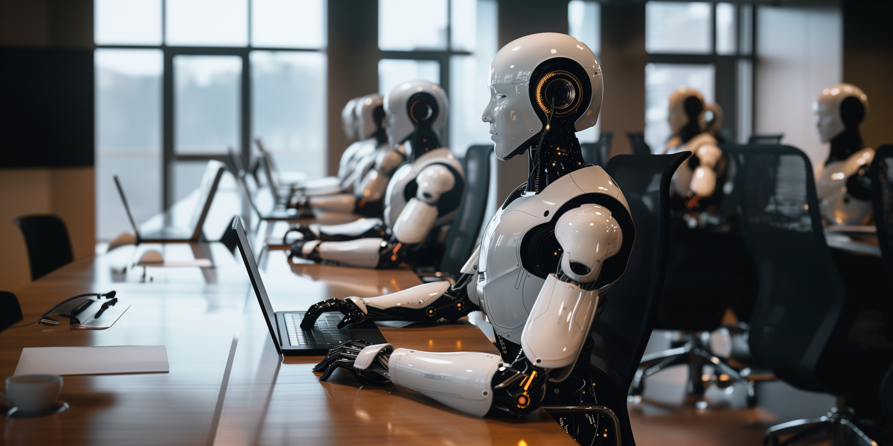 A professional and sleek image suitable for corporate presentations, featuring a modern office setting with AI-generated characters in business attire, conveying a sense of sophistication and expertise.