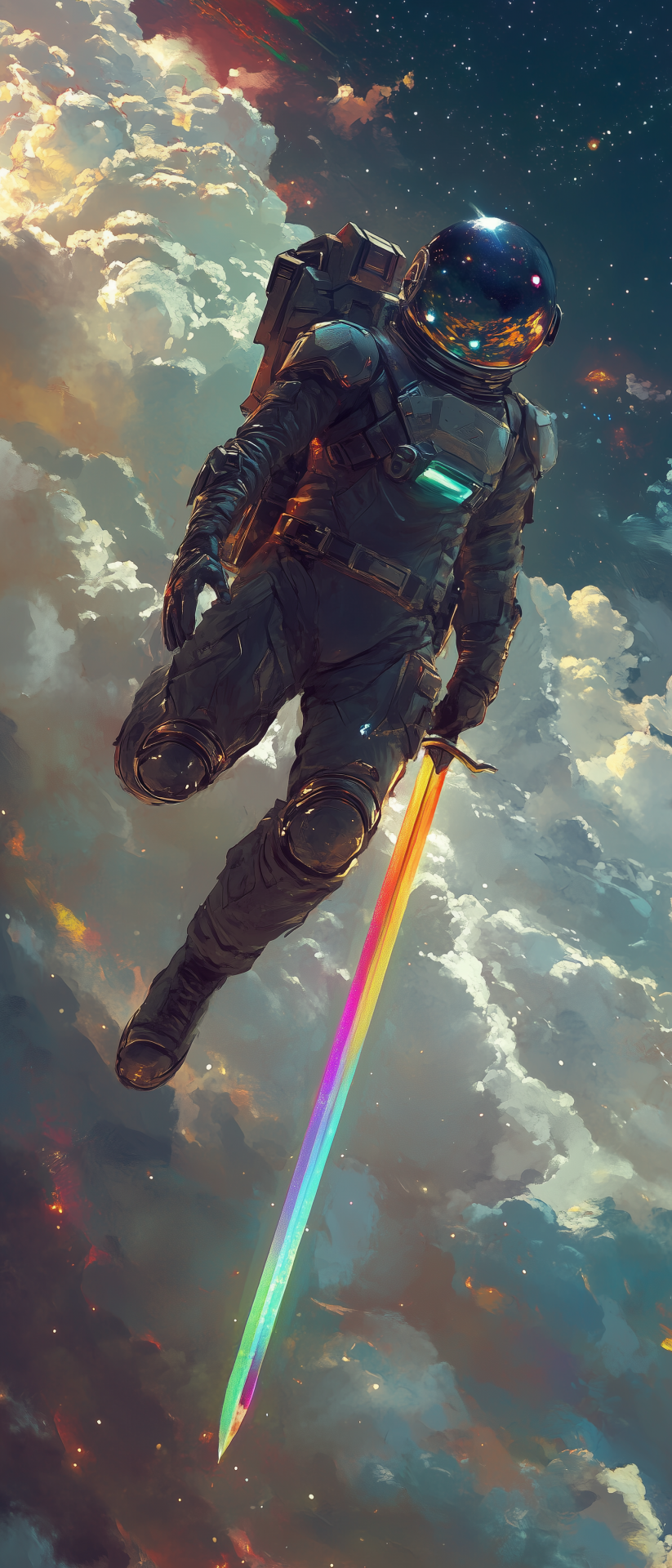 This illustration features a mystical knight floating among fluffy clouds, brandishing a vibrant rainbow sword. The artwork is infused with a dreamlike quality, reminiscent of renowned artists' unique styles.