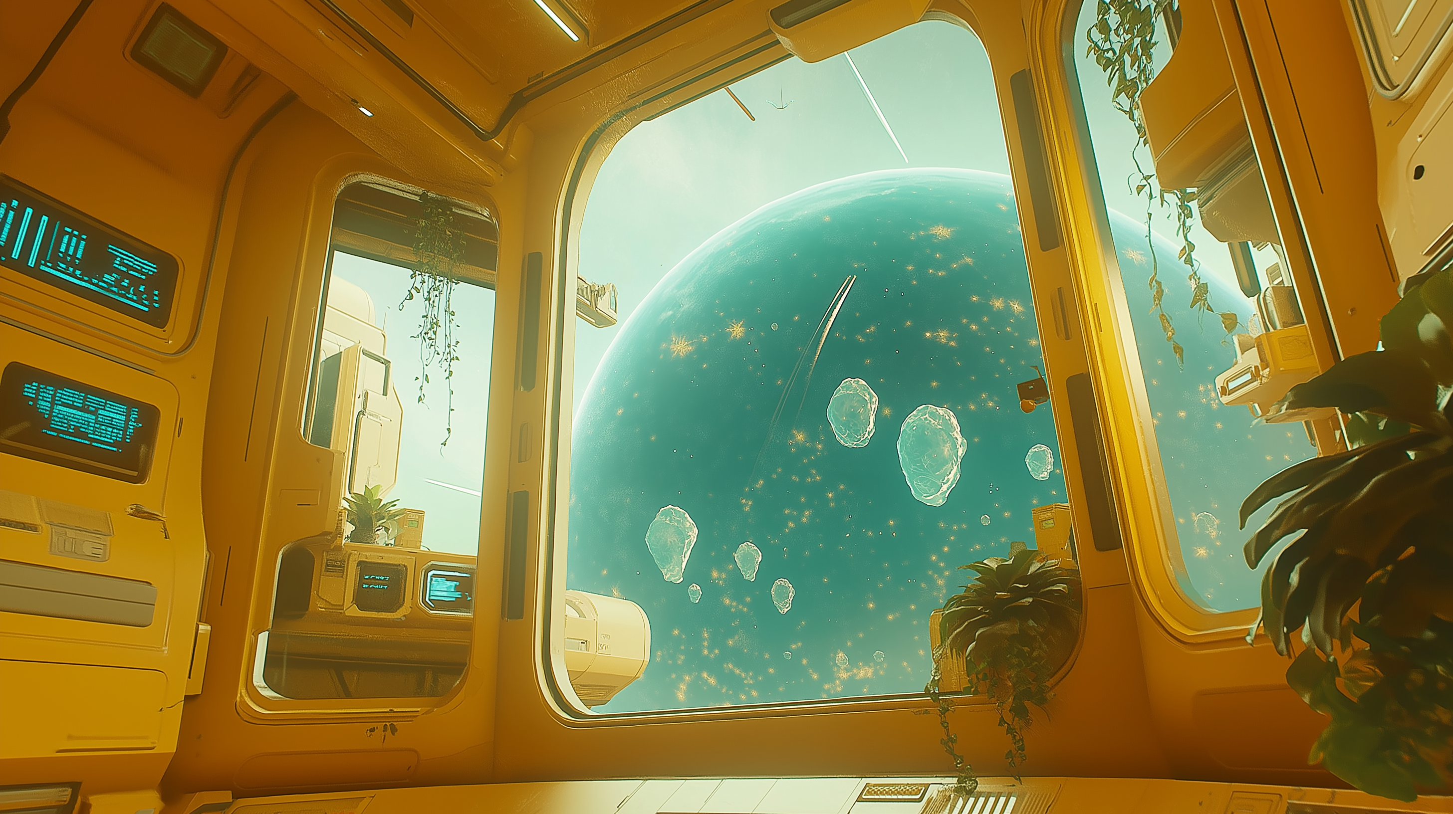 This image showcases a hyperrealistic low angle view of a vast starship's control room, filled with vibrant colors and ethereal lighting. It features dramatic windows displaying a distant planet and surreal liquid neon accents, creating an otherworldly ambiance.