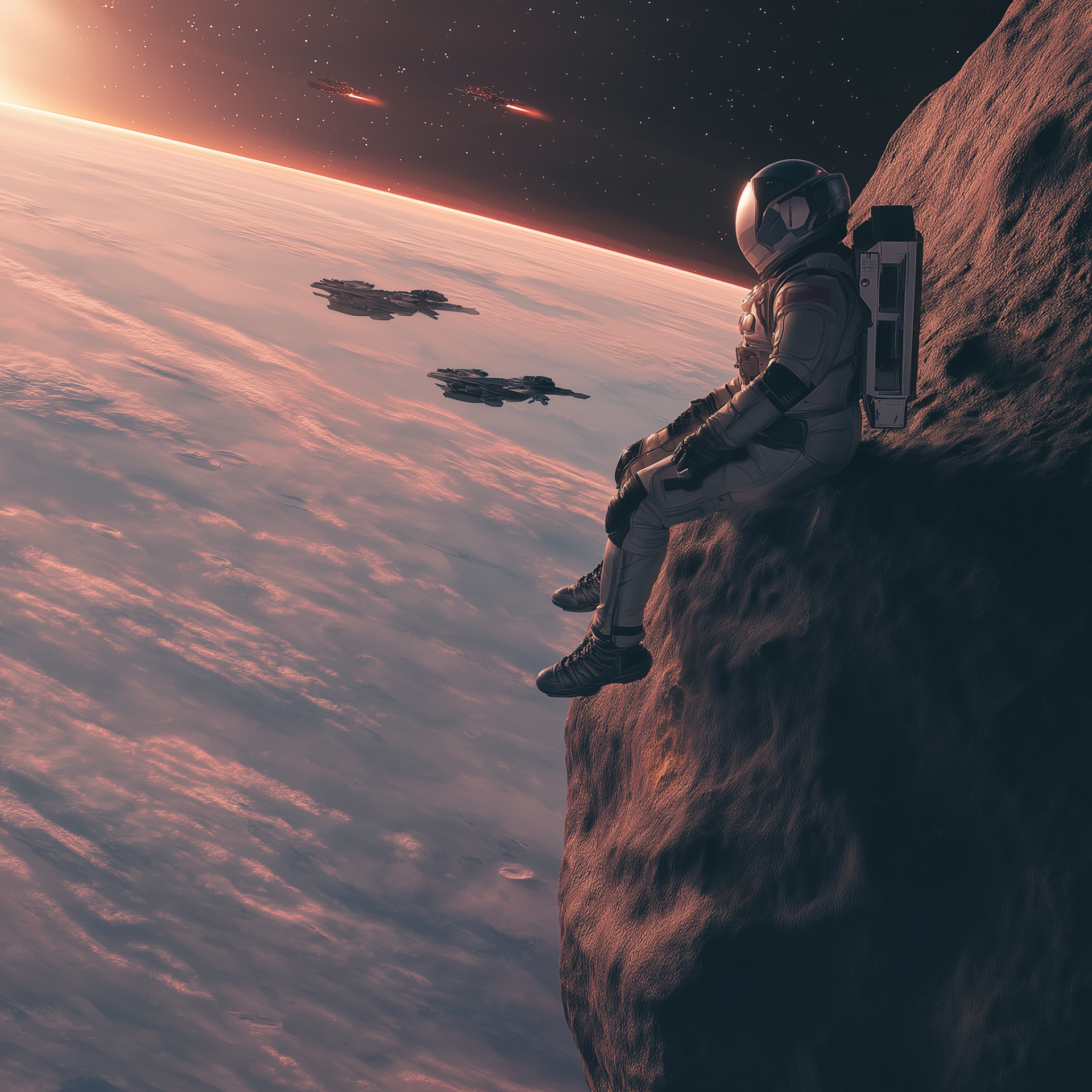 A spaceman sits on a floating rock, gazing down at a distant planet below. The scene is illuminated by cinematic lighting, creating an epic and photorealistic view of the cosmos.