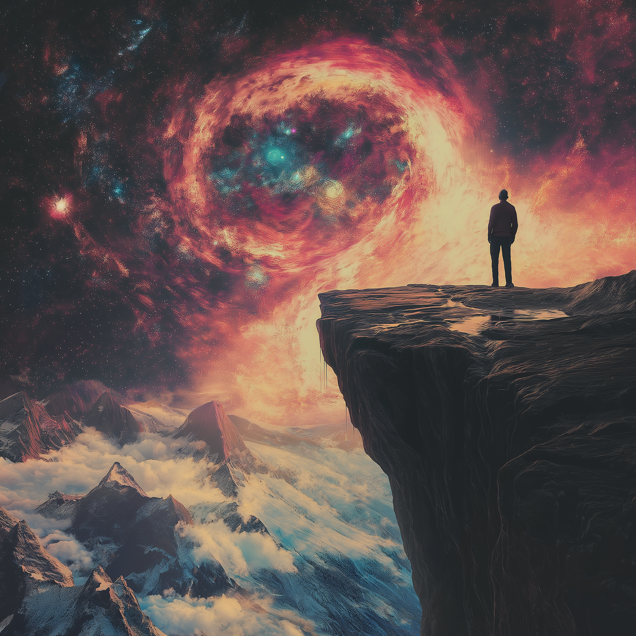 This illustration depicts a stunning view of the edge of the universe, where cosmic elements collide with vibrant colors. The scene evokes a sense of awe and wonder, showcasing the vastness and mystery of outer space.