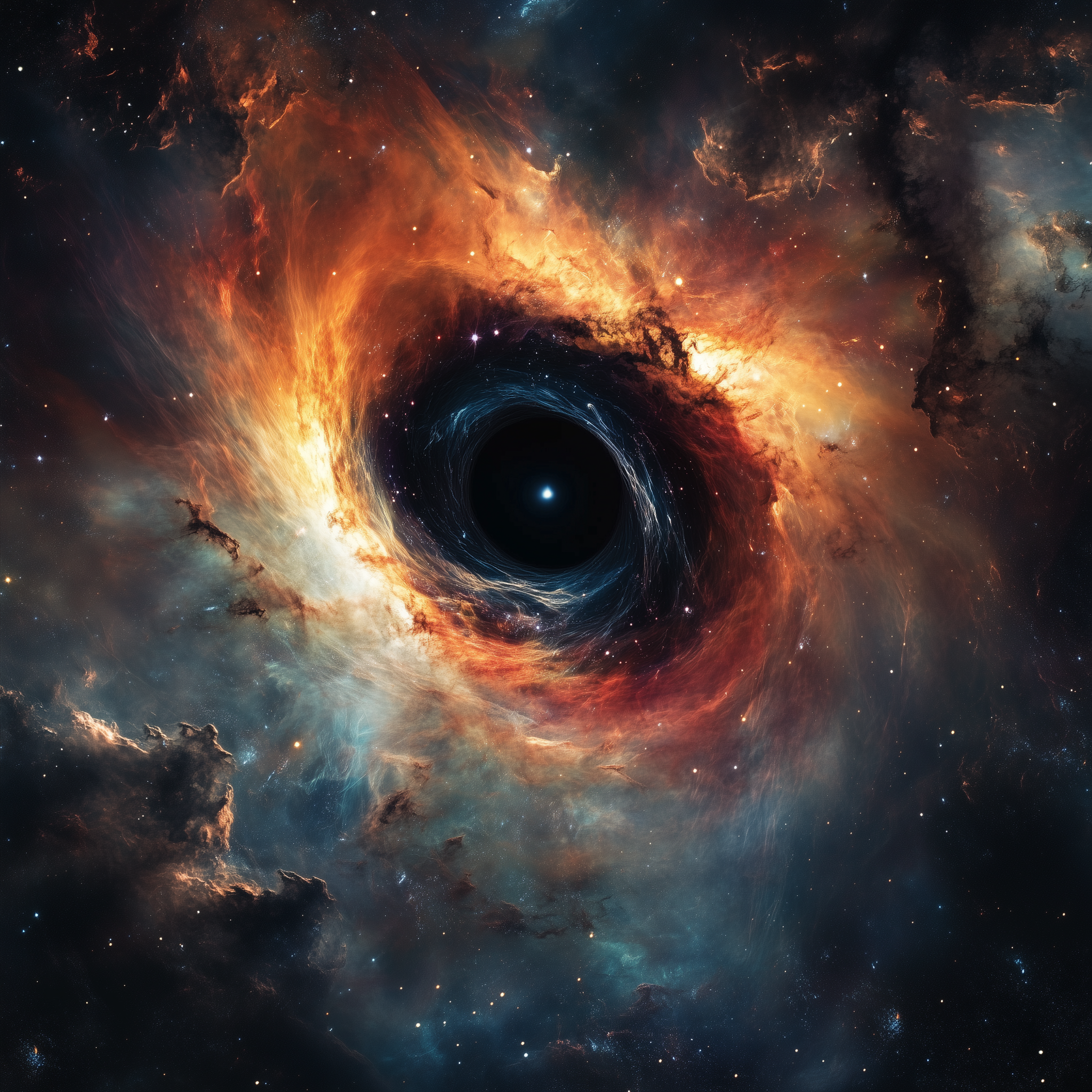 An ethereal nebula swirls with vibrant colors, surrounding a mysterious black hole at its center. Floating in the cosmic expanse is a surreal eyeball, adding a touch of eerie fascination to the scene.