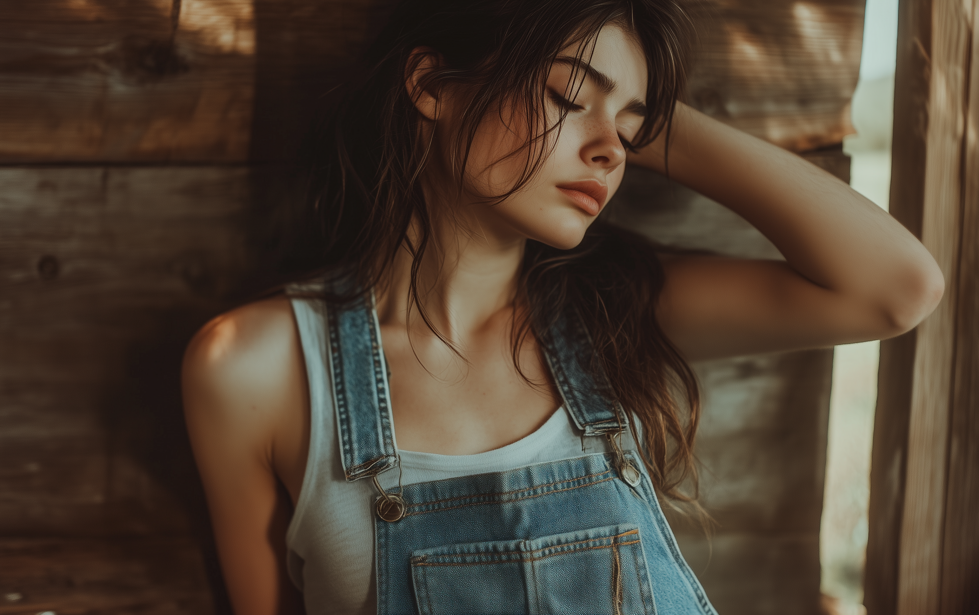 A close-up of a young woman wearing denim overalls sitting inside a rustic barn, exuding a tired vibe. The image has a faded color palette with a yellowish-brown tint, reminiscent of 1990s film photography.