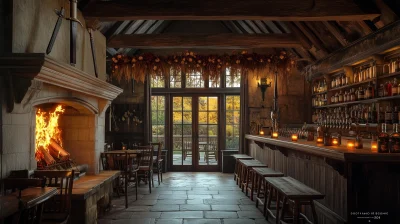 This image captures a warm and inviting atmosphere, showcasing a house with transparent windows that reveal a glowing fireplace. A cozy sofa adorned with a soft blanket enhances the feeling of comfort and tranquility associated with autumn.