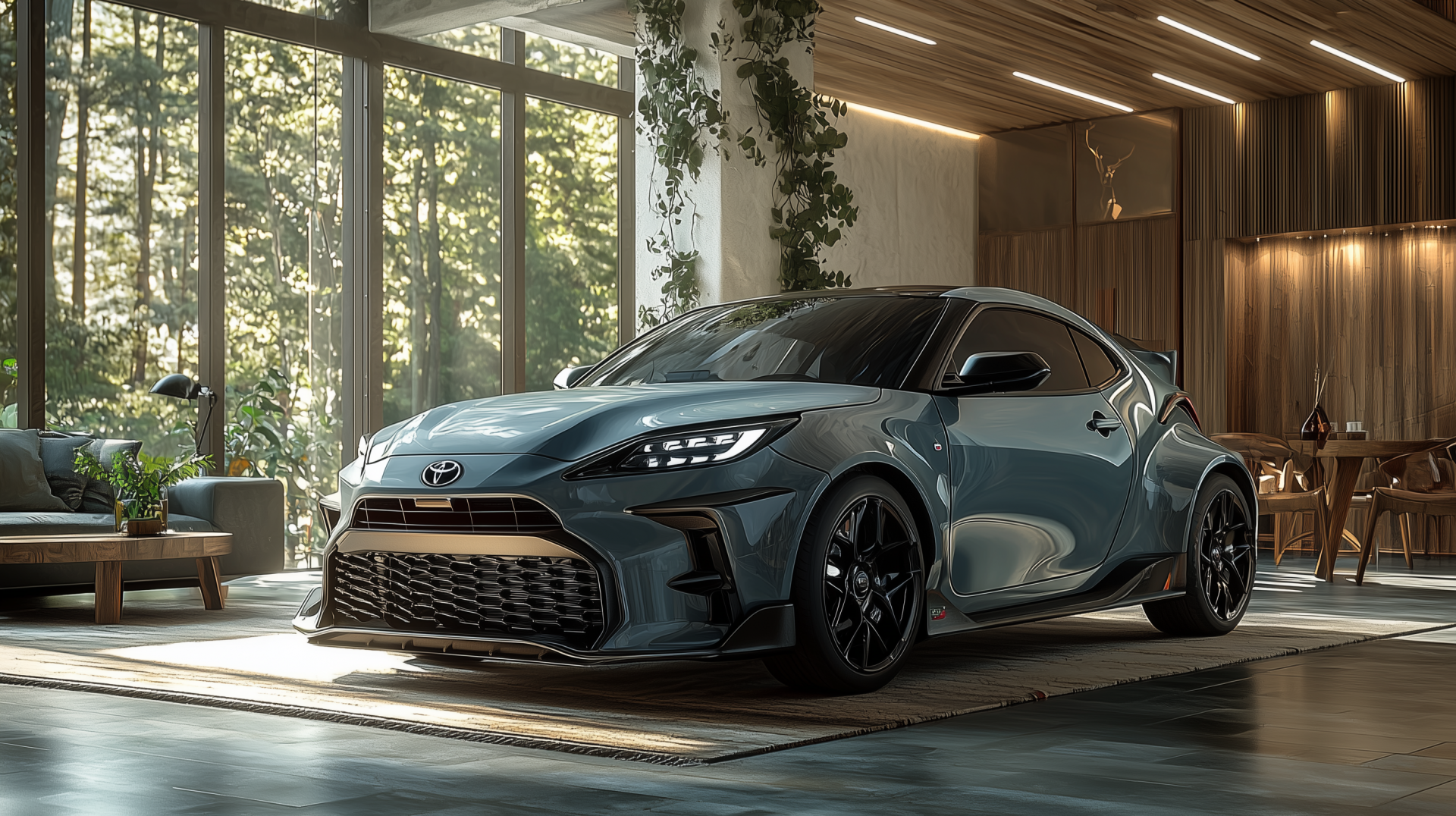 This image features a stunningly realistic rendering of a modern car placed in a warm and inviting living room. The car is displayed prominently against a backdrop of soft lighting and cozy furnishings, creating a unique blend of automotive elegance and home comfort.