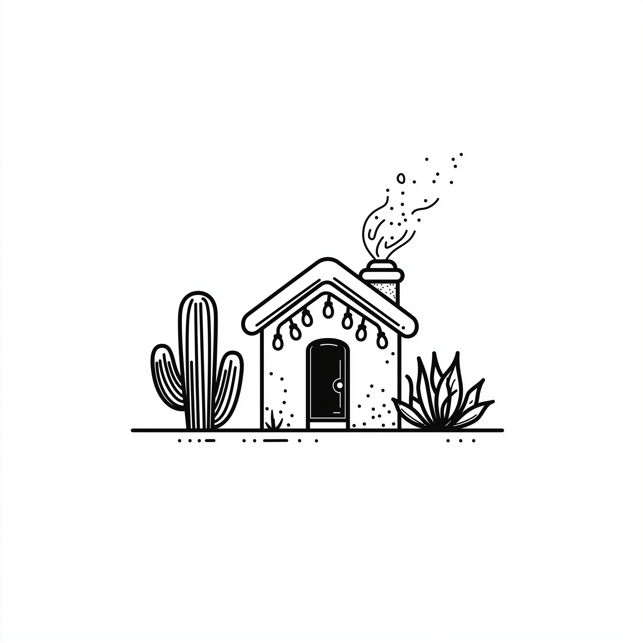 This image showcases a minimalistic line art logo on a white background, featuring a cozy cottage with a chimney and smoke rising. The design includes Christmas lights and a hint of snow, alongside a cactus and aloe vera plant that accentuate the desert feel.