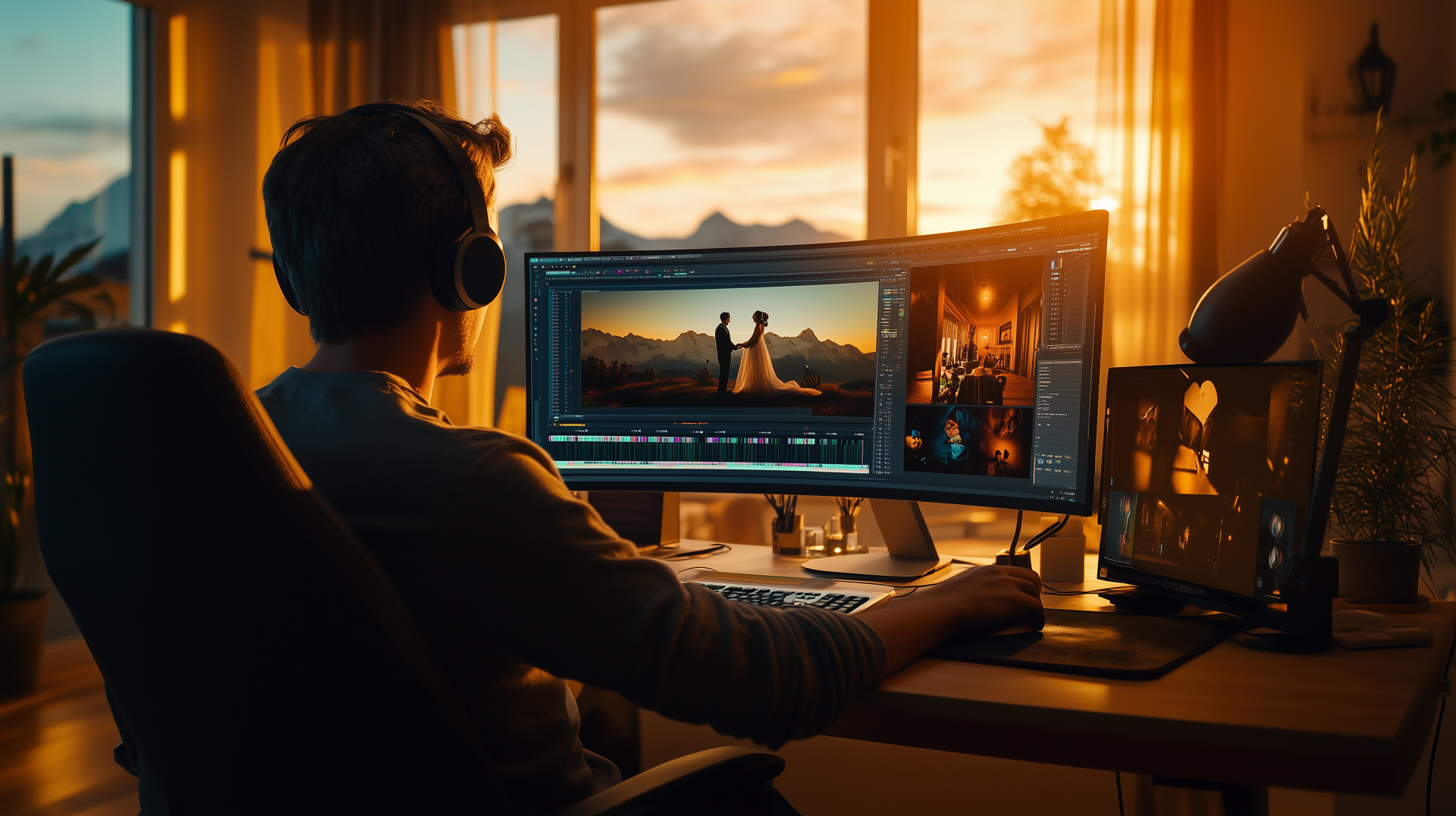 The image captures a serene home office illuminated by warm, golden sunlight during sunset. A young video editor is focused on his work, creating a warm atmosphere with stylish decor and inviting colors.