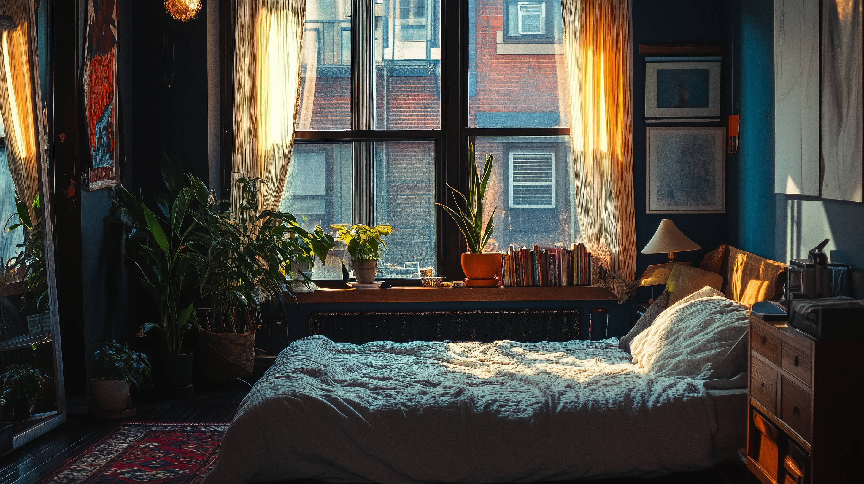 This image captures the warm and inviting atmosphere of a sunlit New York apartment in the morning. The soft light filters through the windows, creating a tranquil and cozy space filled with comfort.
