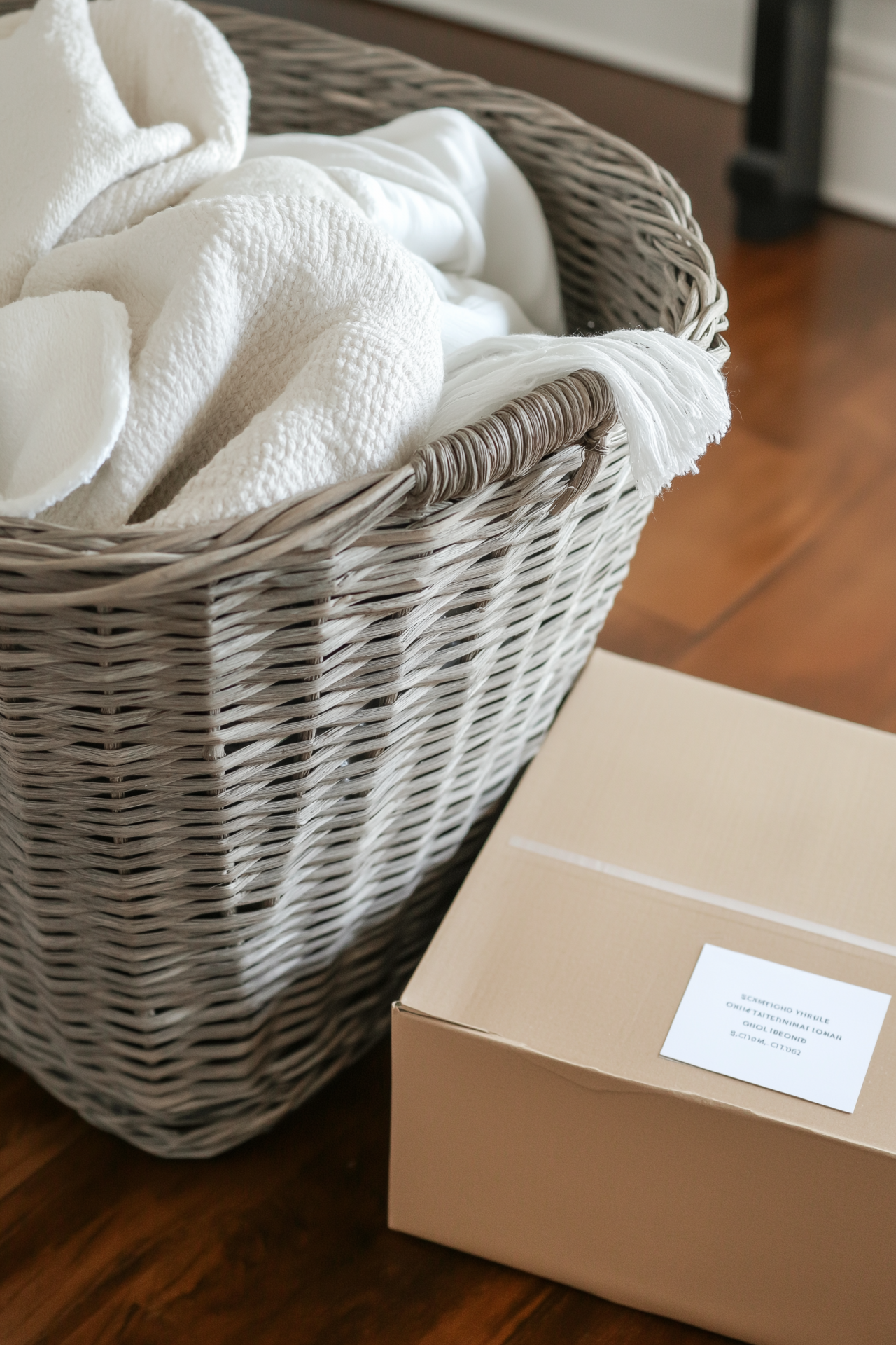 The image depicts a warm and inviting home organization area featuring a large woven basket. The rustic gray tones and soft white linens create a comfortable and serene atmosphere.