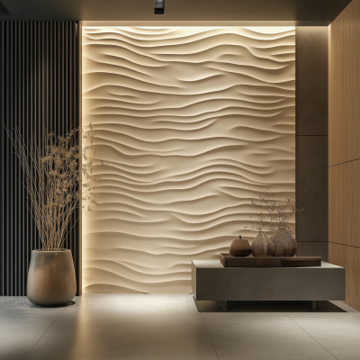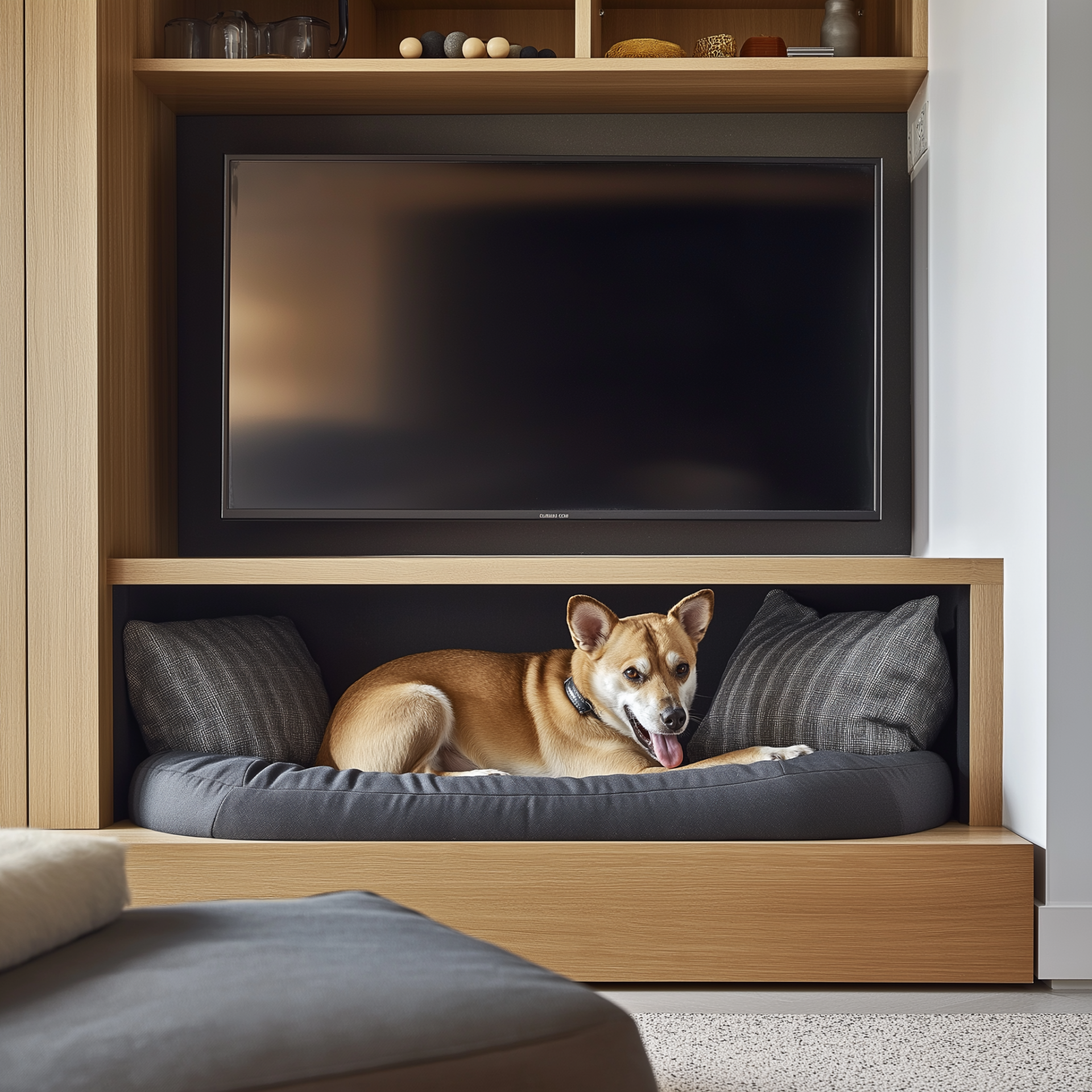 The image showcases a beautifully designed pet area seamlessly integrated into a modern living room. With a luxurious pet bed, stylish storage for toys, and minimalist wooden shelves, the space exudes comfort and elegance.