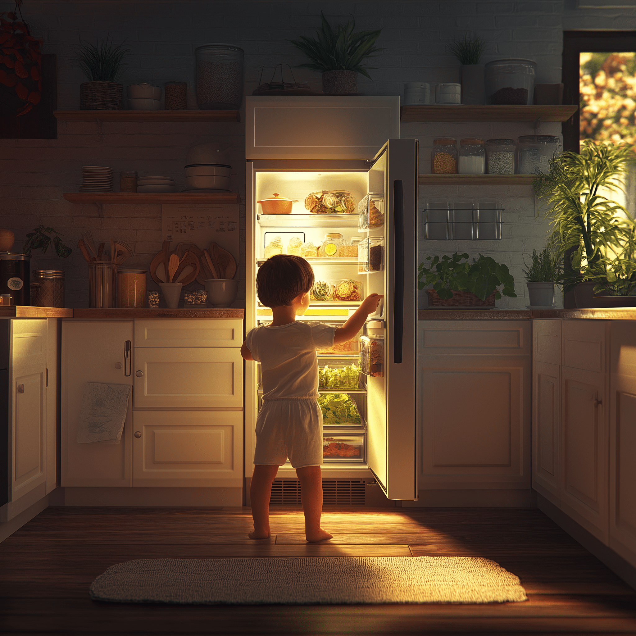 A cozy kitchen scene featuring a child joyfully opening a fridge, creating a sense of warmth and innocence. The soft light enhances the clean and cute atmosphere of the room.