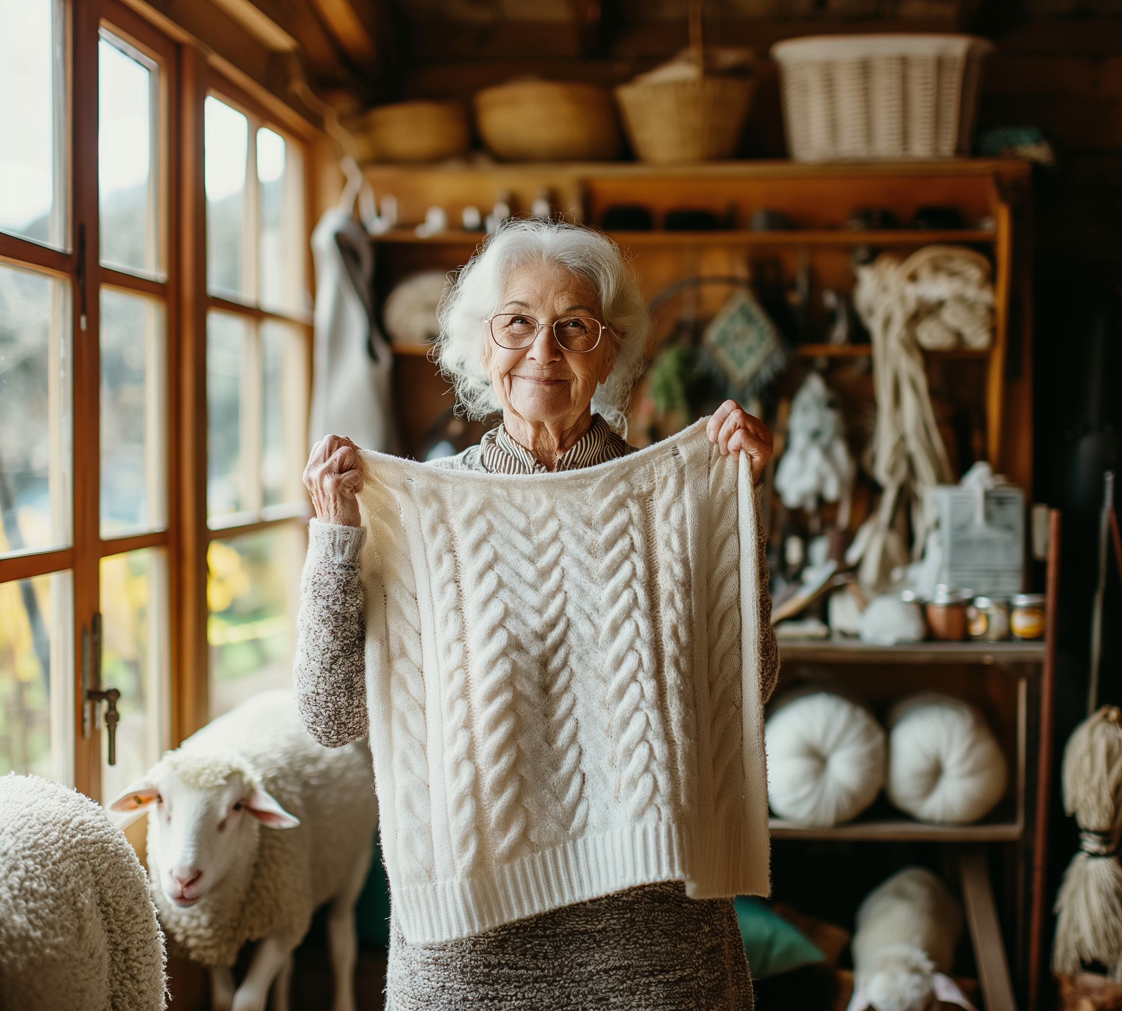 The image captures a sad elderly woman holding her hand-knit cream cable sweater in a cozy cottage. The warm natural lighting and soft focus on the background create an inviting yet melancholic atmosphere, with shelves filled with yarn and knitting tools visible behind her.