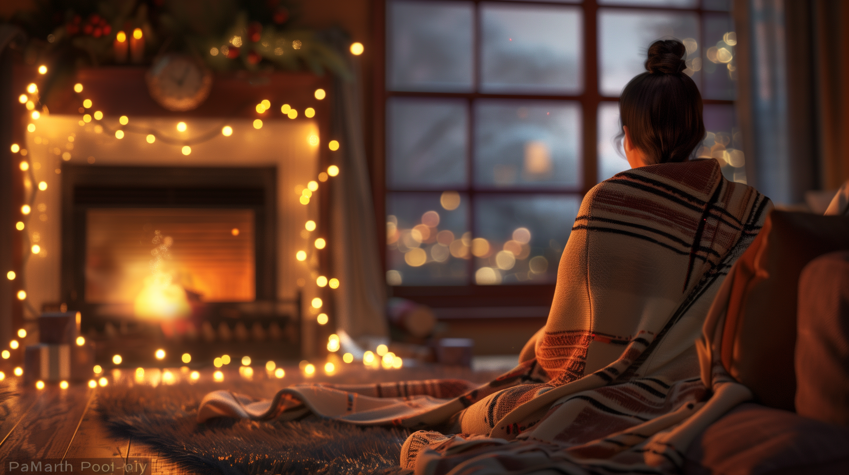 This image features a woman wrapped in a warm blanket, sitting peacefully by the fire with a cup of hot cocoa. The cozy atmosphere is enhanced by soft indoor lighting and festive decorations, creating a serene and relaxing environment.