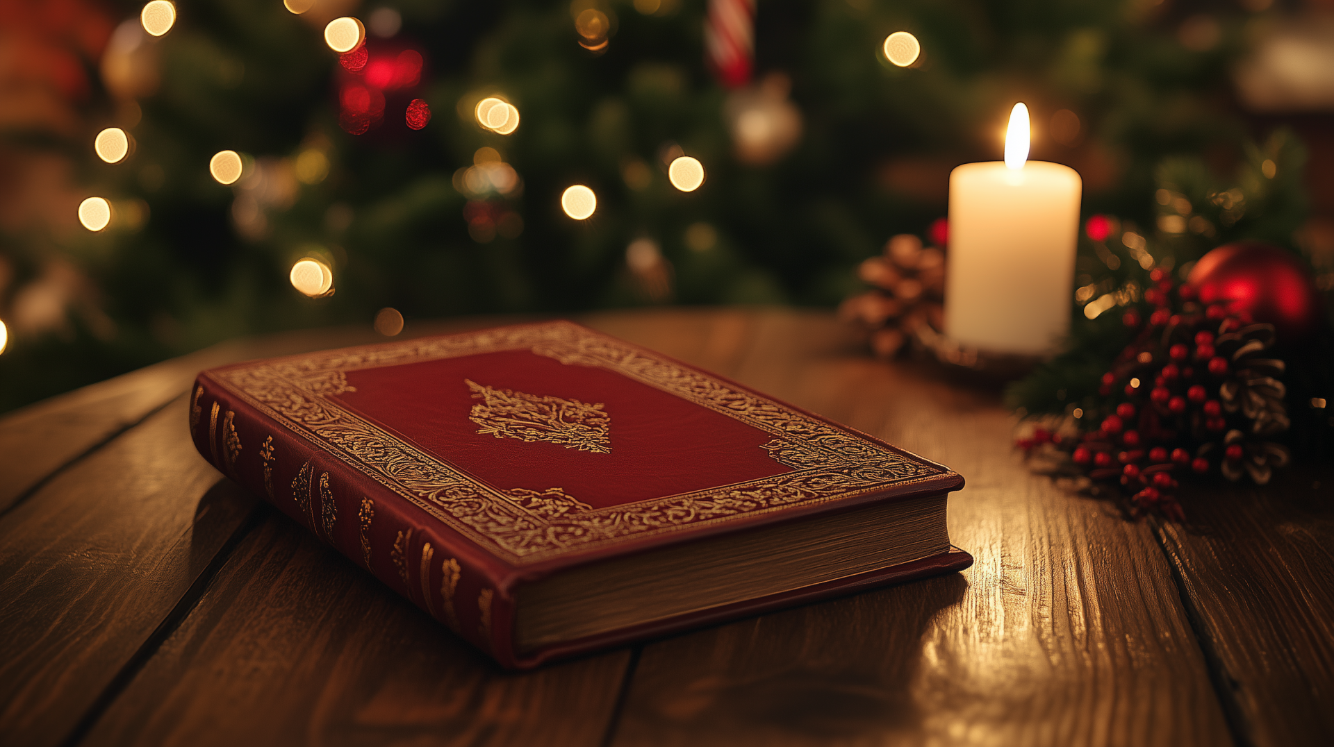 This image features a beautifully ornate red leather bound book laying closed on a wooden table. In the background, a softly glowing Christmas tree adds a warm and cozy atmosphere.
