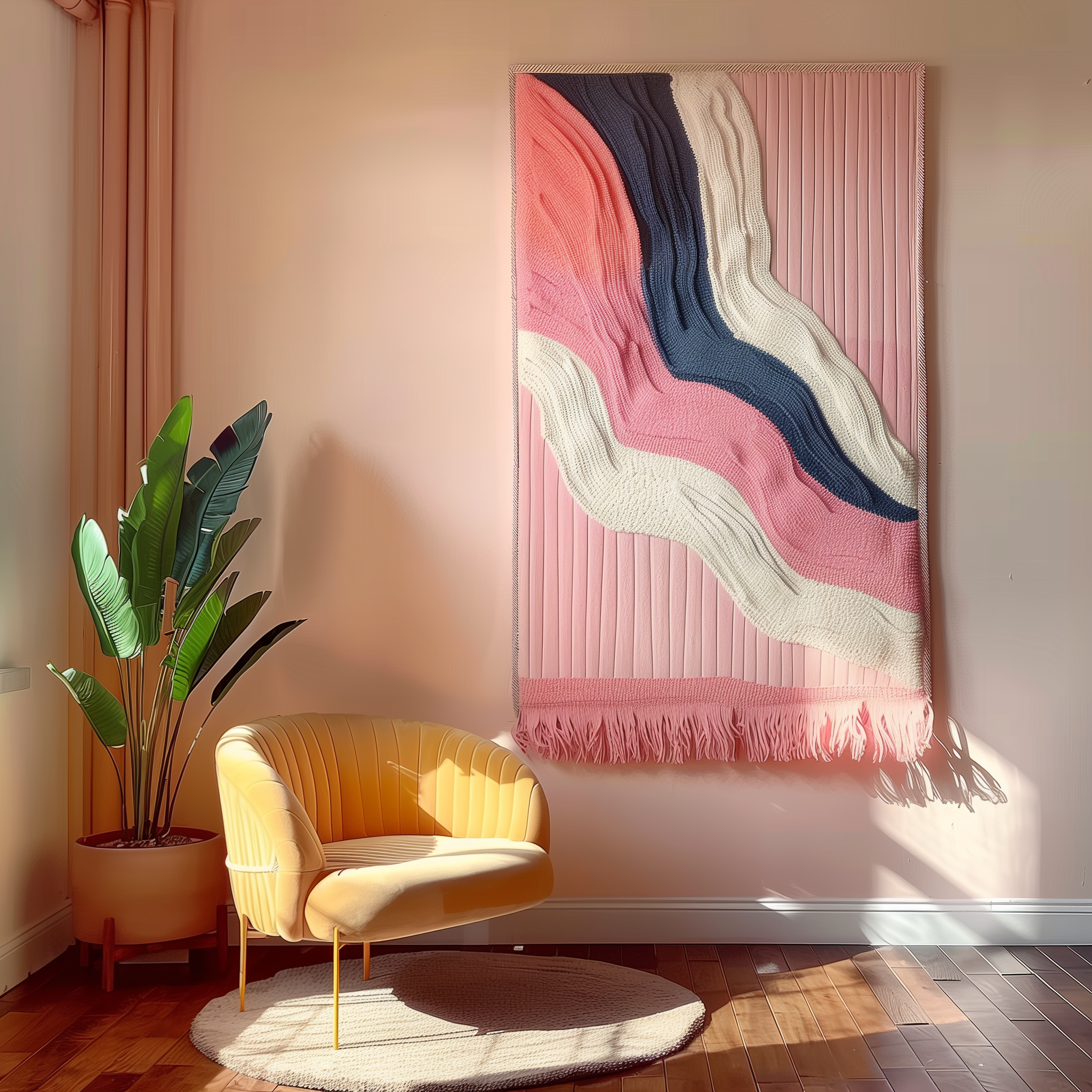 The image captures a closeup view of a cozy room featuring a beige wall and a warm wooden floor. The soft pink and white color scheme adds a modern and inviting touch to the space.