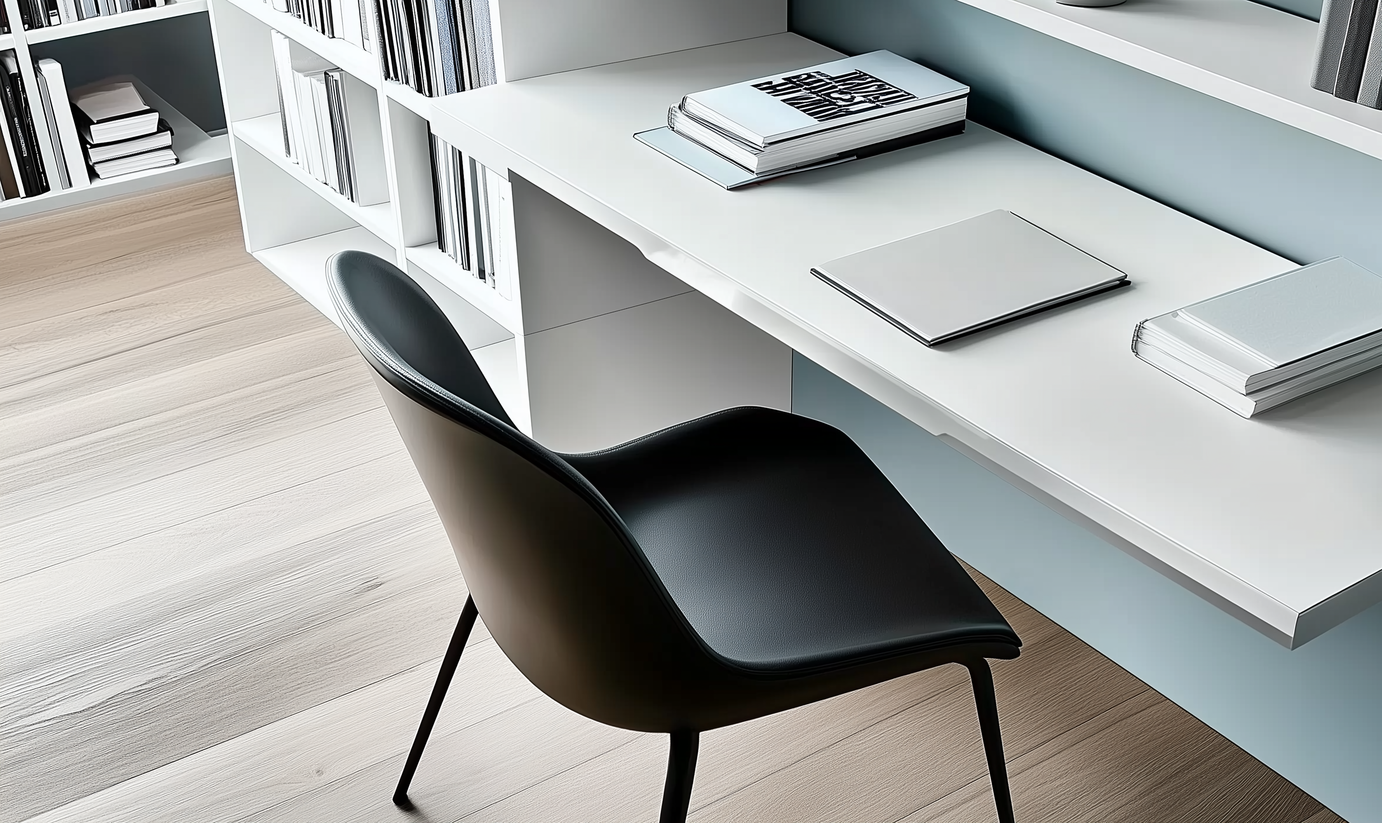 This image captures a serene small home office space with a light blue color scheme. The close-up view features a sleek white desk and a modern black chair set against a warm wood floor, creating a calm and inviting atmosphere.