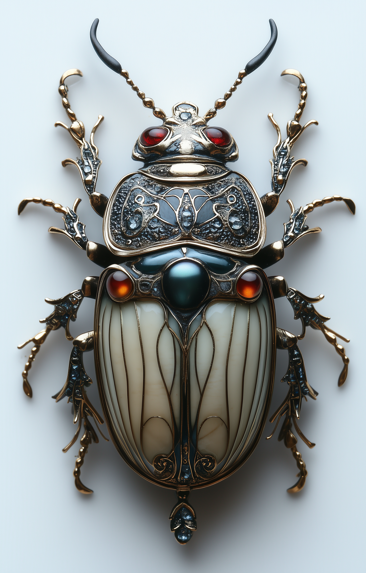 This illustration features an old brooch shaped like a scarab with wings, showcasing a symmetrical design. Set against a clean white background, the black and white colors emphasize the intricate details of the brooch.