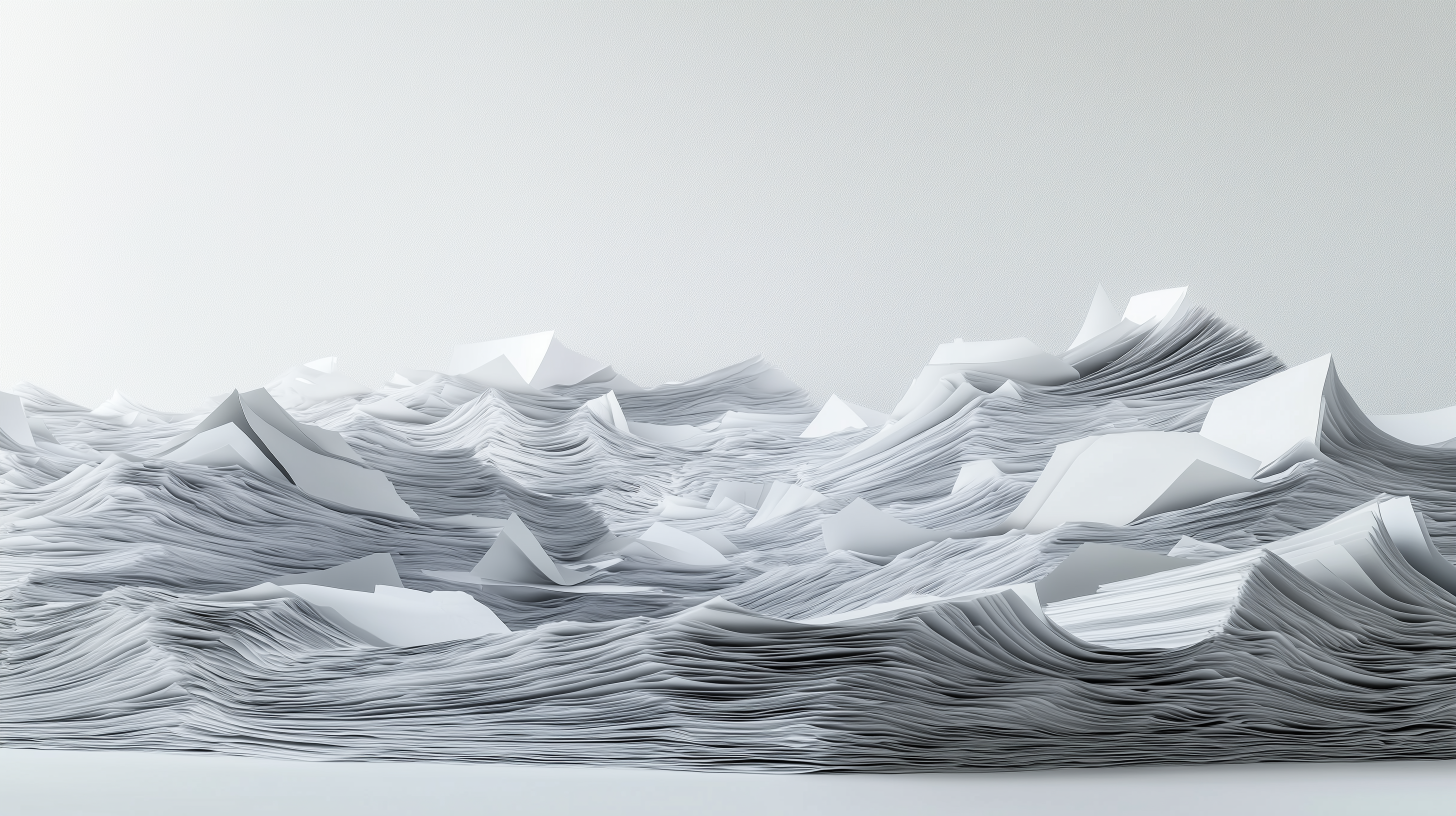This illustration features a growing line that transforms from a single sheet of paper into a detailed landscape made of paper stacks and files. The artwork is set against a crisp white background, emphasizing the intricate forms and structures created from paper.