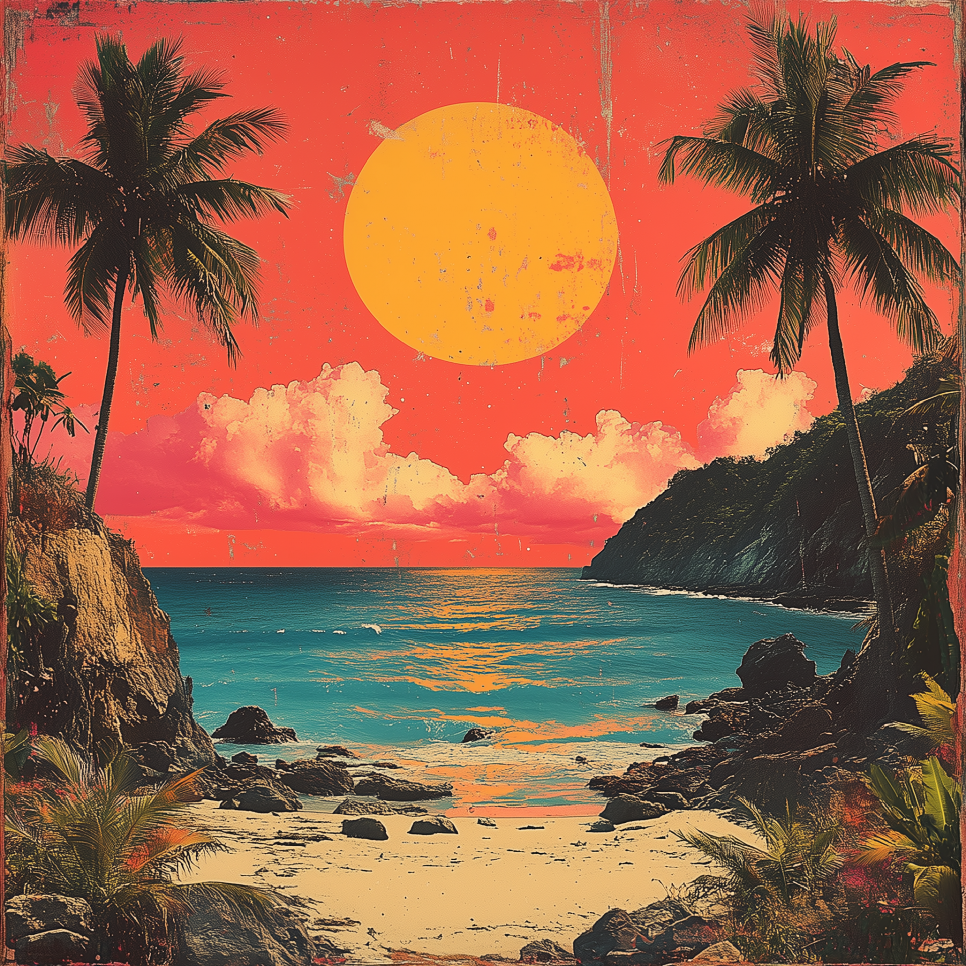 The image features a dreamlike beach landscape filled with bold colors and unexpected elements. This retro zine visual blends surrealism with vintage aesthetics, creating a whimsical view that captivates the imagination.