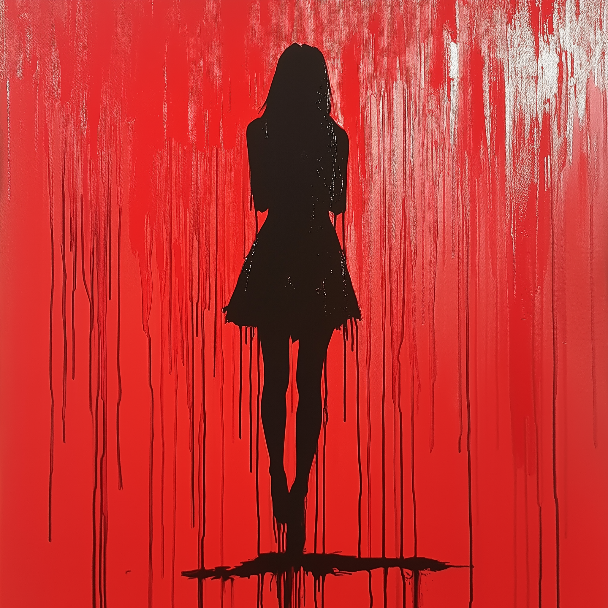 This illustration features a dynamic representation of a woman performing squats, depicted in vibrant red hues that drip down the canvas. The artwork conveys strength and movement, with fluid lines that capture energy and intensity.