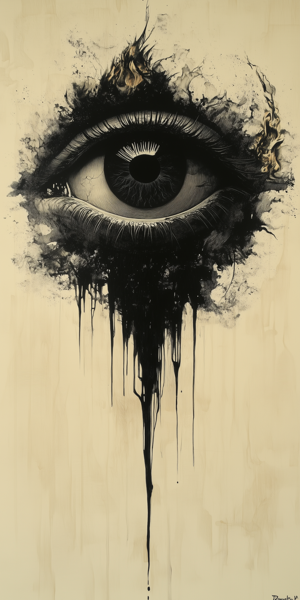 This illustration depicts a stylized eye encircled by intricate black decorations that evoke a mystical aura. The surrounding flames and a black sun enhance the dramatic and enigmatic feeling of the artwork.