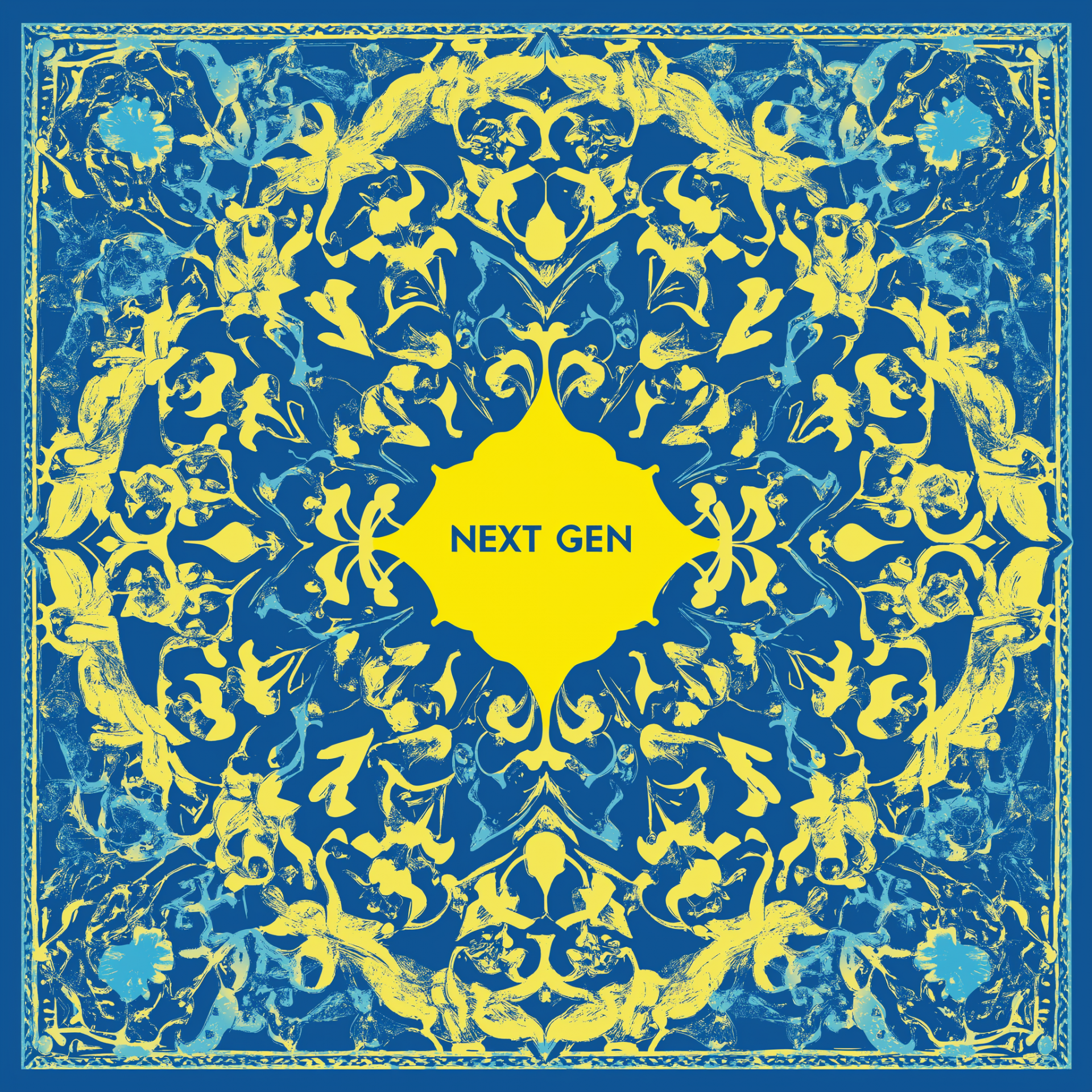 This image features a striking logo set against a light cyan blue background. Surrounding the logo are elegant Uzbek ornamental patterns, creating a powerful and monumental visual effect.