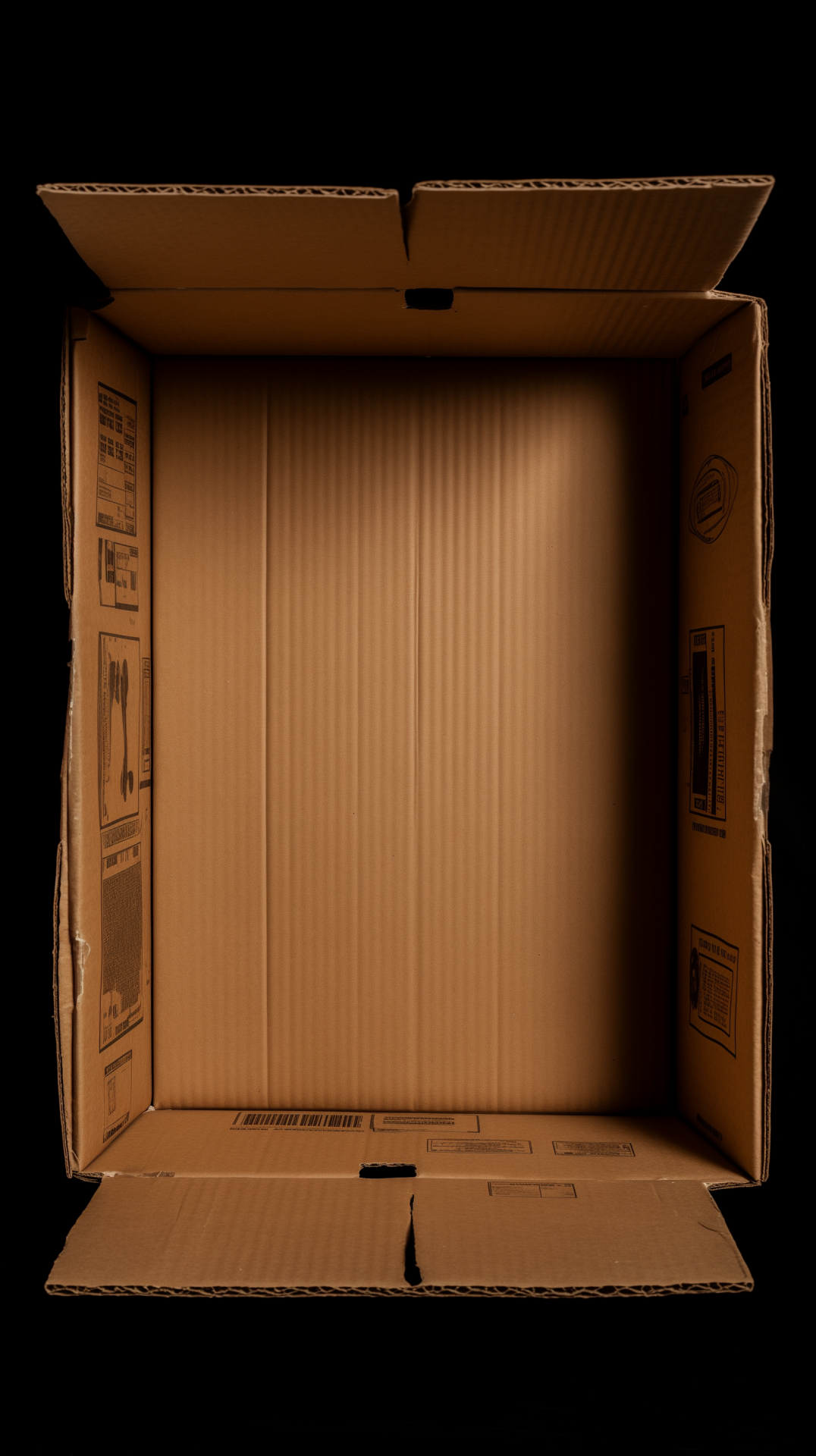 This image features a top-down view of a flat, unfolded cardboard box, showcasing its structural details and texture. The scene captures a sense of simplicity and versatility, perfect for creative projects and designs.