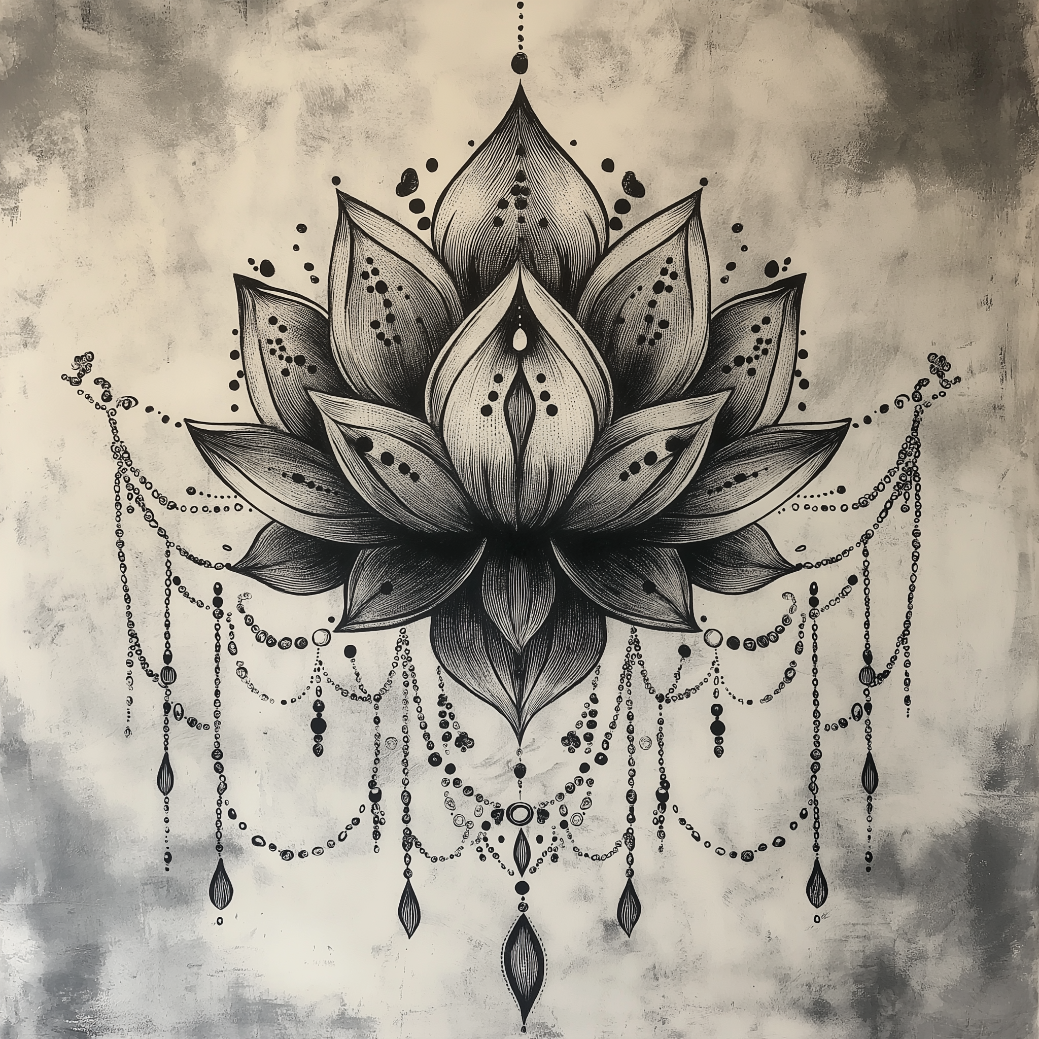 This image features a lotus mandala stencil characterized by low detail, predominantly in black and grey. The geometric design is accentuated by thin chains that elegantly span from the left to the right of the mandala.