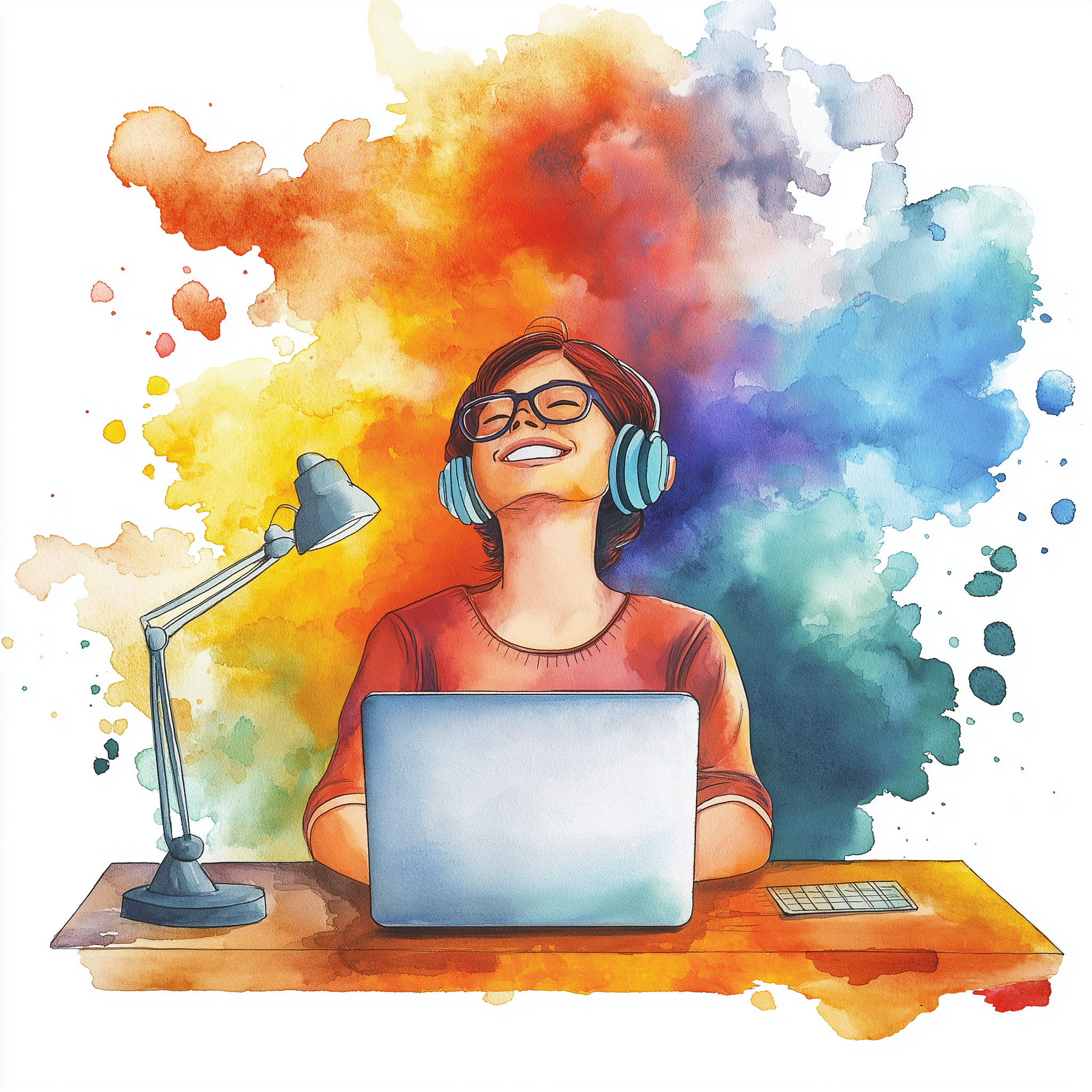 This illustration features a joyful, neurodivergent person engaged in their work environment, utilizing adaptive technology. The background is a vibrant watercolor abstract, filled with deep colors that evoke a sense of creativity and inclusivity.