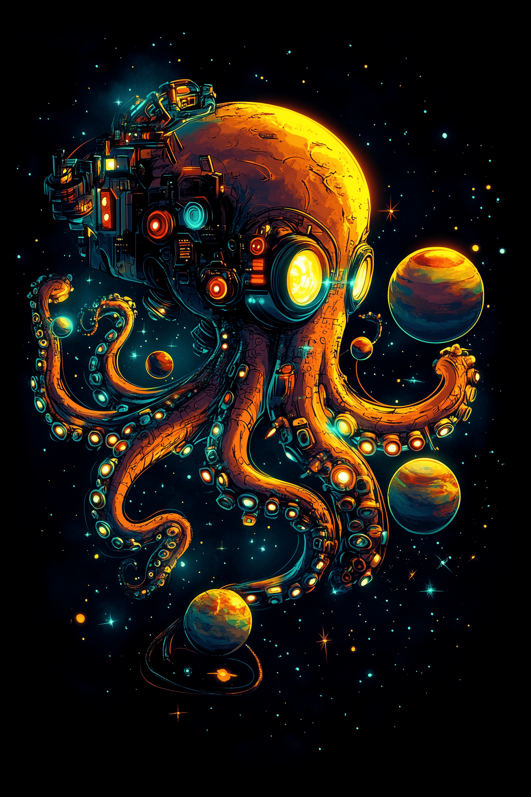 This illustration depicts a futuristic octopus with mechanical tentacles, gracefully floating in a dark star-filled void. The creature holds vibrant planets illuminated with neon accents, creating a mesmerizing cosmic scene.