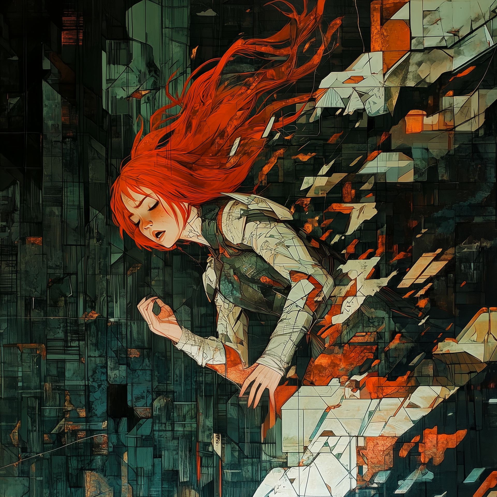 This illustration features a striking redheaded warrior girl caught in a geometric containment field. Her distressed expression and dynamic body language convey a sense of struggle and depth, surrounded by a vivid, glitchy aesthetic.