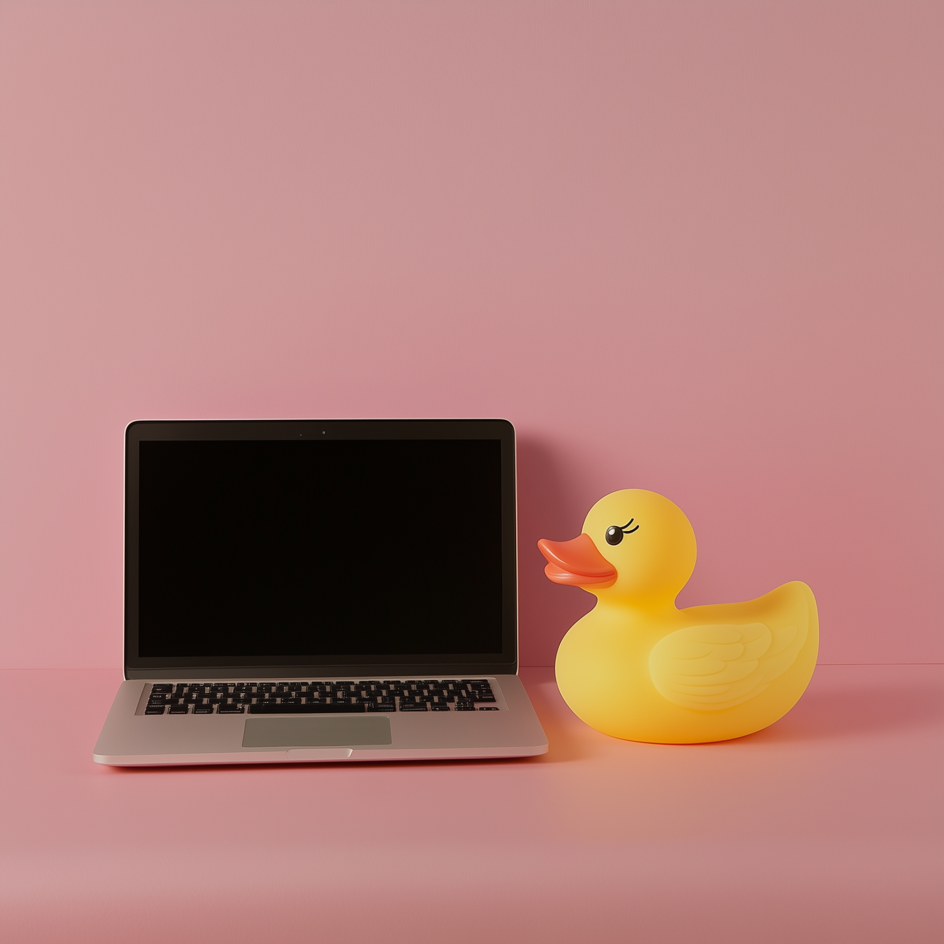 This illustration depicts a surreal fusion of a rubber duck and a laptop, combining playful charm with modern technology. The vibrant colors and whimsical design create a fun and imaginative atmosphere.