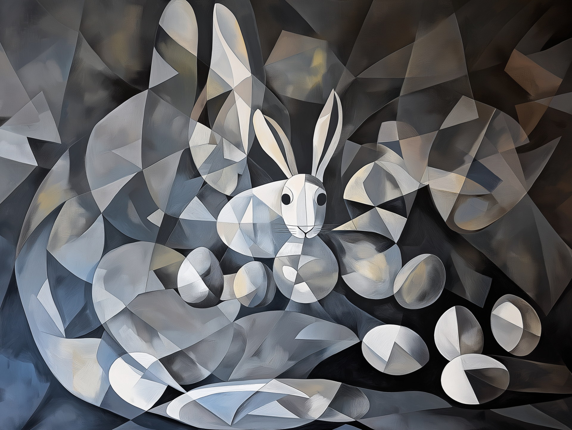 This illustration features an abstract representation of an Easter bunny surrounded by eggs, all depicted in a cubist style reminiscent of Picasso's Guernica. The use of geometric shapes and monochromatic tones creates a striking and thought-provoking composition.