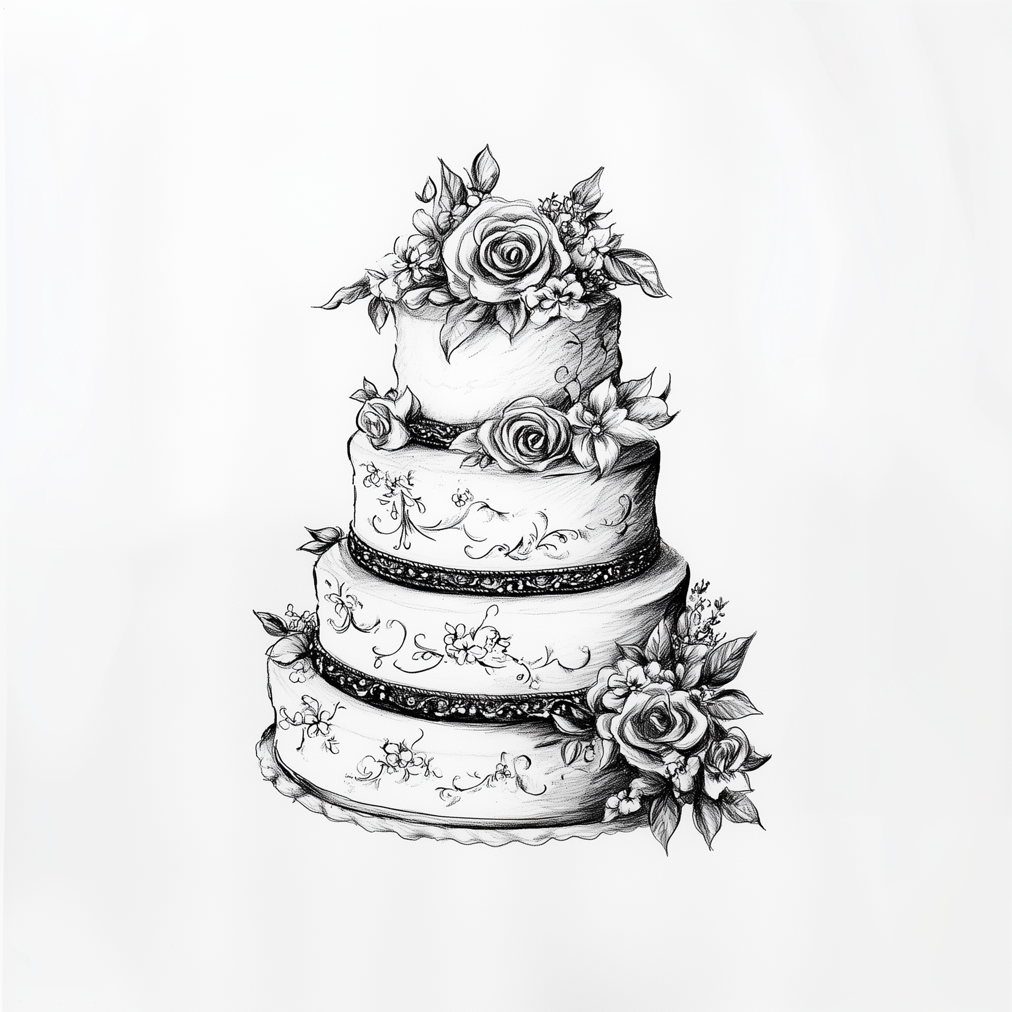A rough black and white sketch showcasing a unique cake design, featuring intricate details and creative patterns.