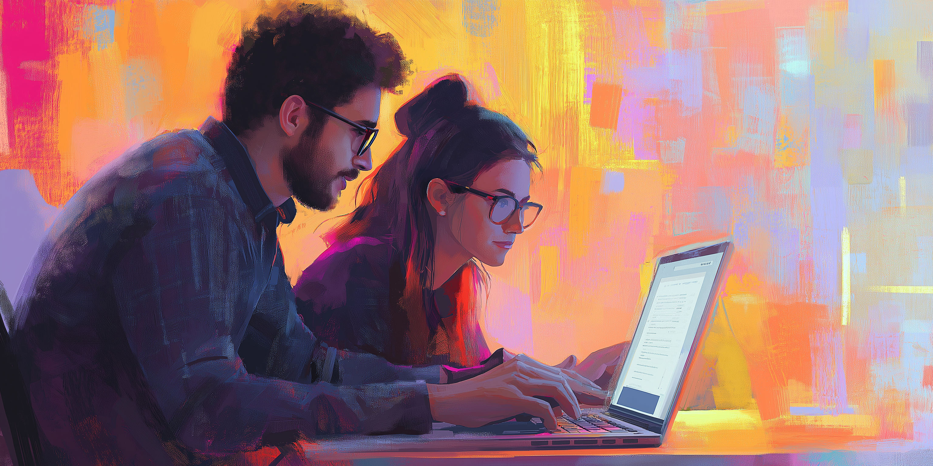 This illustration depicts a male and female developer working together near a laptop, surrounded by engaging colors. The scene radiates a happy and collaborative atmosphere, emphasizing teamwork and creativity.