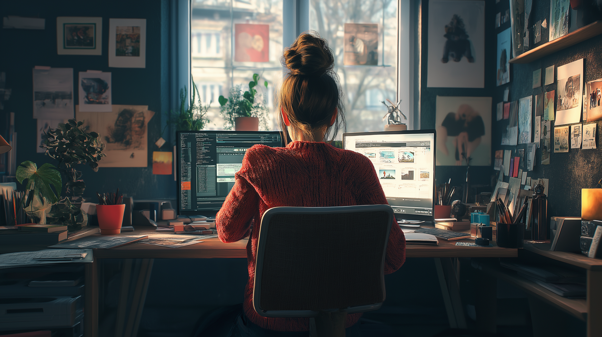 A talented graphic designer is immersed in her craft within a well-lit room filled with creative tools and materials. The scene captures a hyper-realistic view, emphasizing a cinematic quality that highlights the designer's focus and creativity during the day.