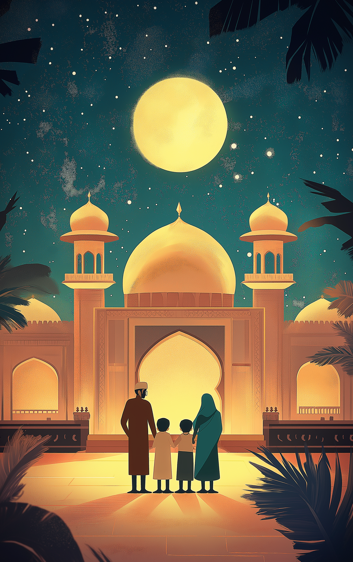 This illustration showcases a charming scene where four Muslim figures interact under a starlit sky. The warm colors and minimalistic design create a whimsical atmosphere, perfect for children's storytelling.