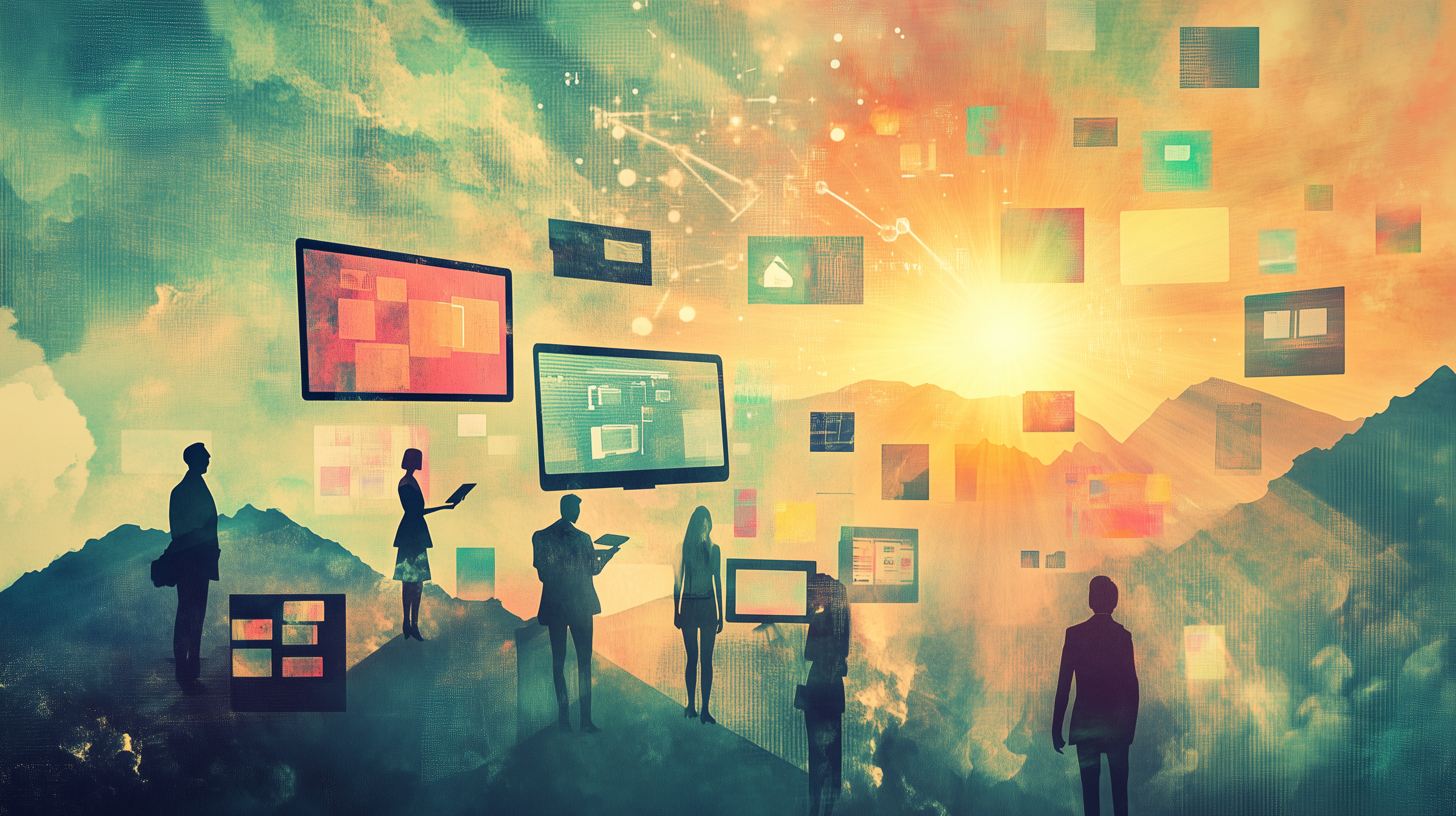 The image features a group of diverse professionals collaborating in a vibrant digital space. The retro vibe is enhanced by bold lines and a warm sunset backdrop, creating an immersive and nostalgic atmosphere.