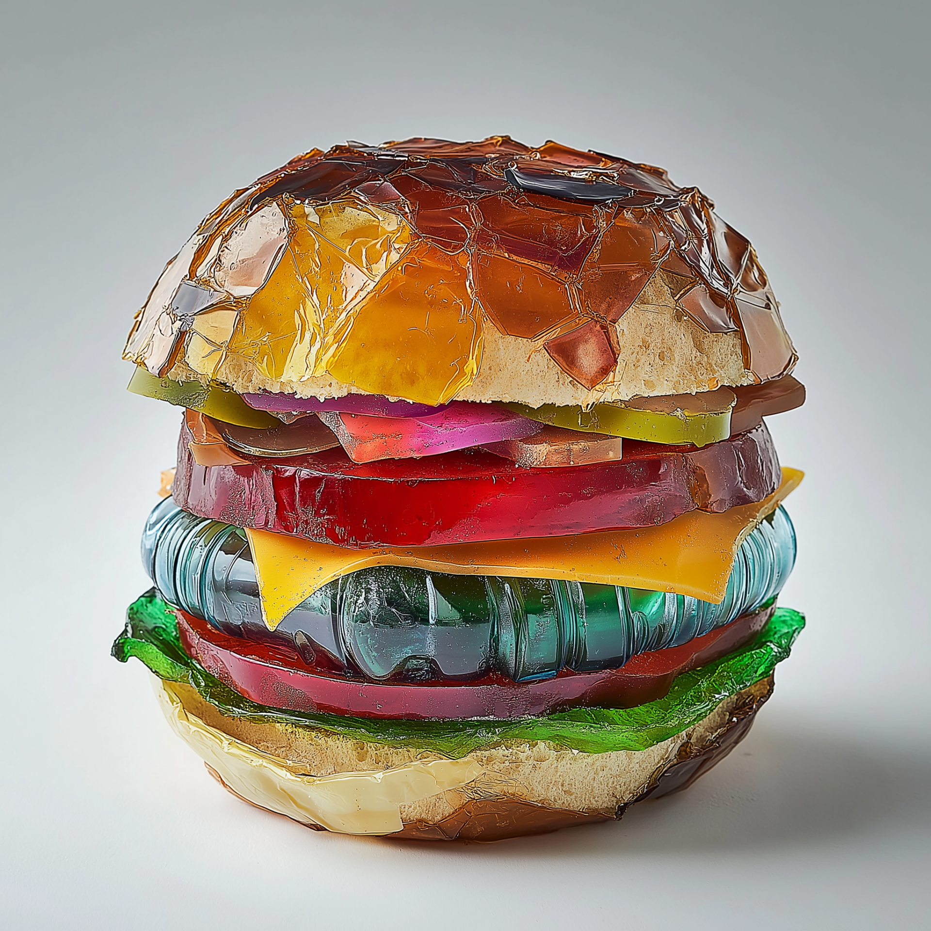 The image depicts a surreal burger where the patty is composed of bright and colorful plastic bottles, while the bun appears to be crafted from transparent glass. This imaginative representation evokes a sense of whimsy and creativity, challenging conventional notions of food.