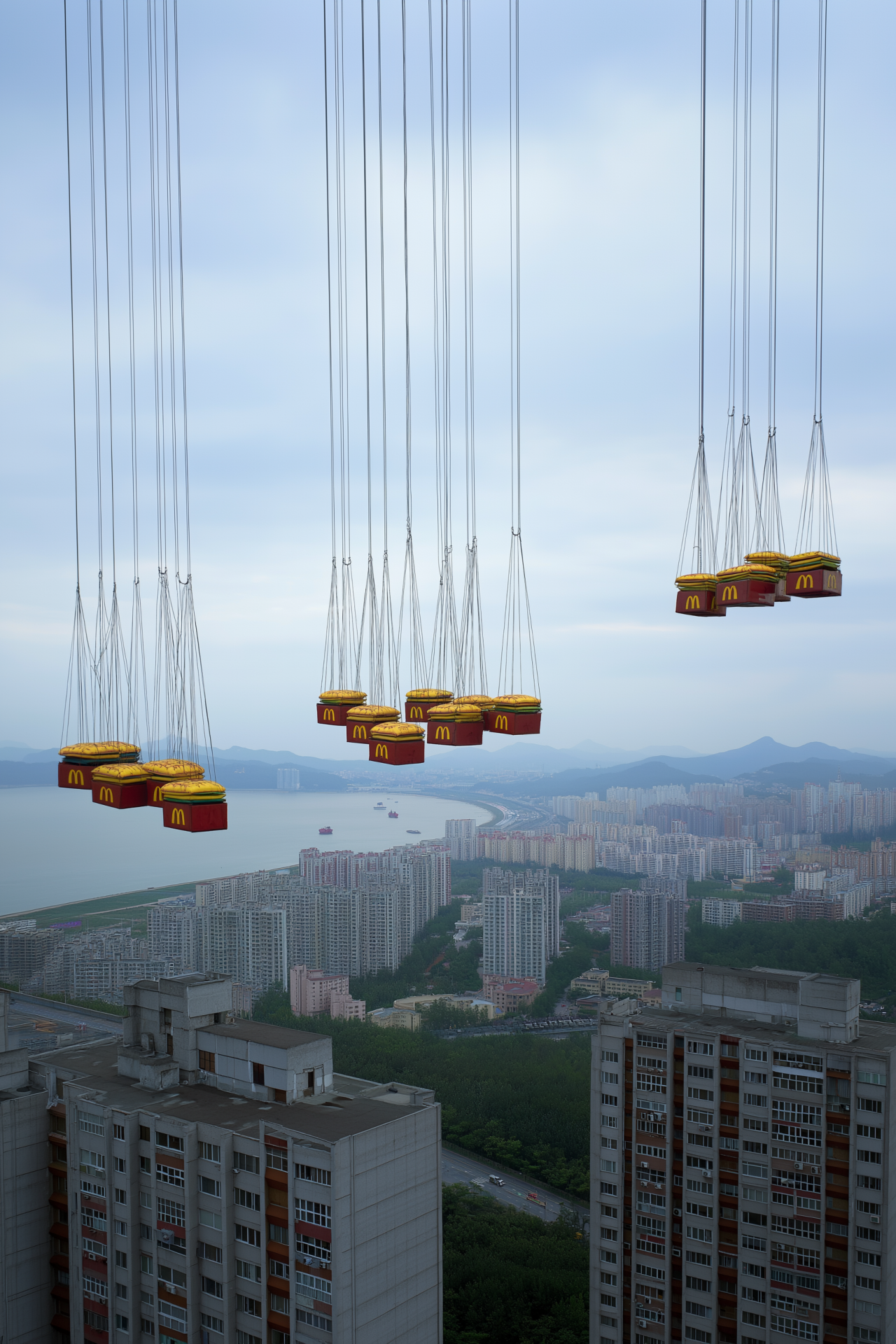 An imaginative scene depicting a surreal air drop of food over a vast urban landscape. The atmosphere is vibrant and unusual, combining elements of humor and social commentary.