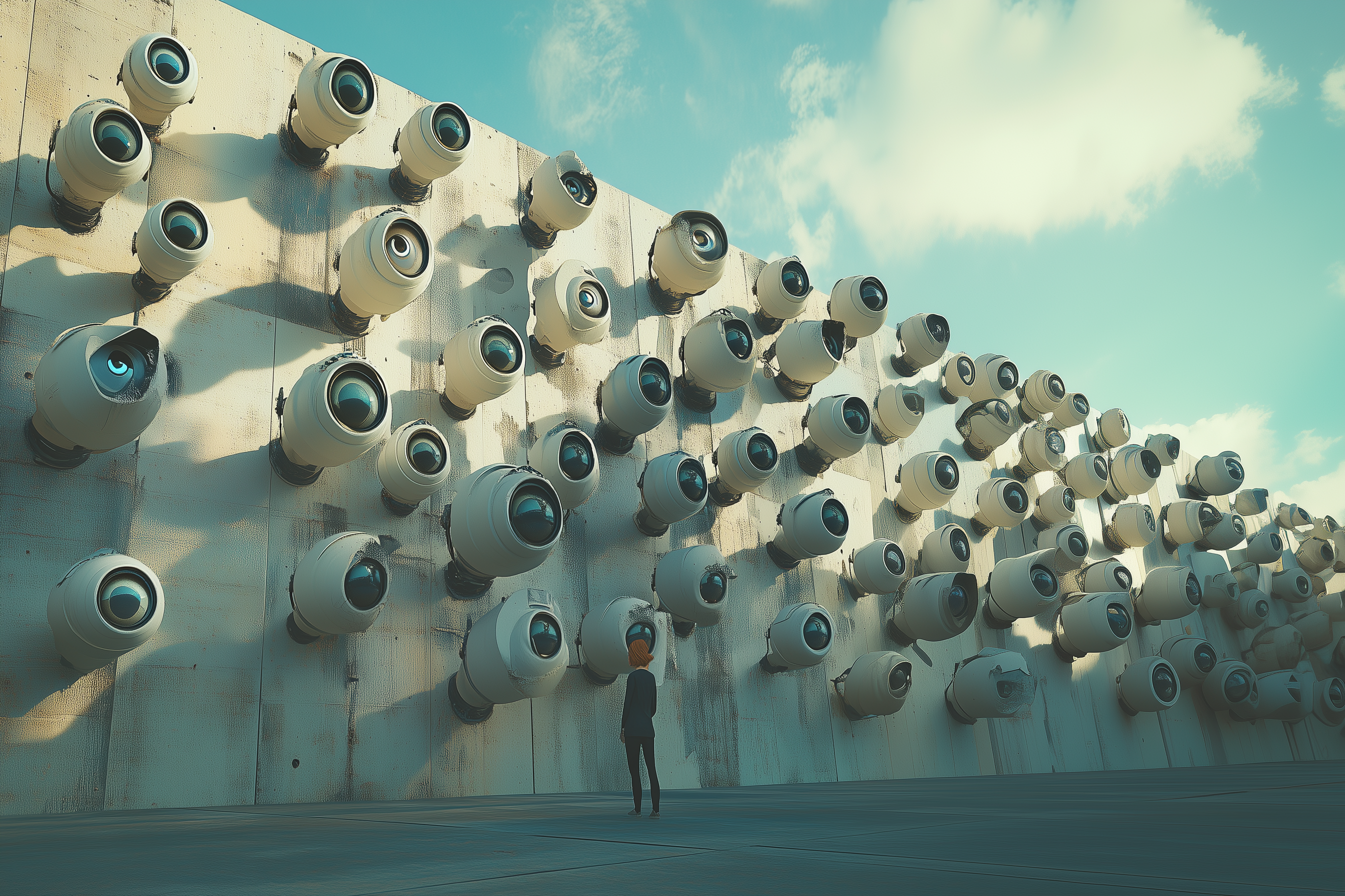 This illustration features a surreal 3D scene populated by numerous security cameras that resemble eyes. A character stands in front of them, adding a creepy yet slightly cute atmosphere to the artwork.