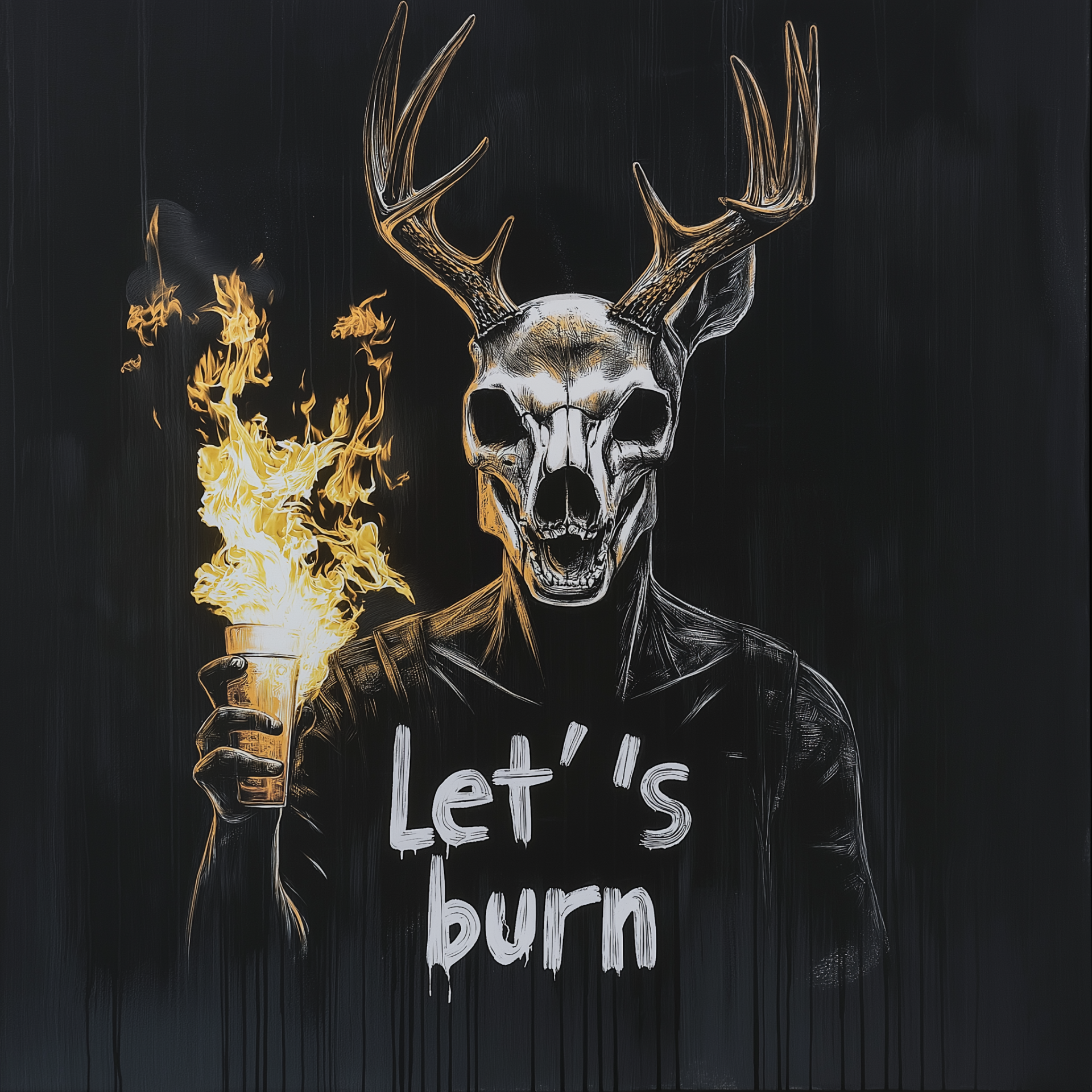 A surreal illustration featuring a deer skull mounted on a human body. The artwork conveys a dark and edgy aesthetic, highlighted by a Molotov cocktail in flames and bold text that reads 'let's burn' in the background.