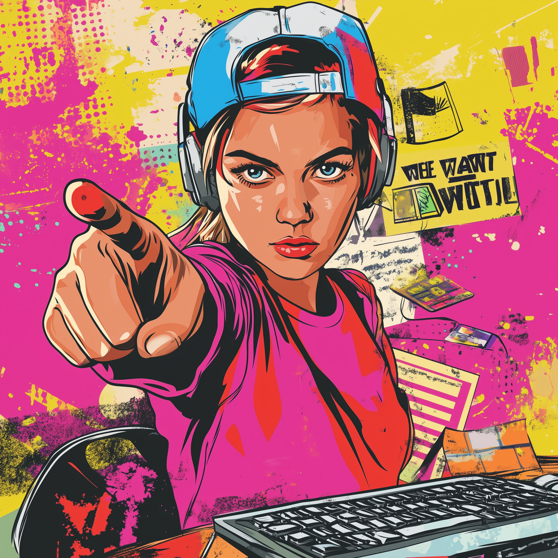 This image showcases a young graphic designer energetically pointing forward while holding a striking 'We Want You' styled poster. The vibrant pop art style and dynamic composition are complemented by graphic design elements in the background, creating an atmosphere of creativity and modernity.