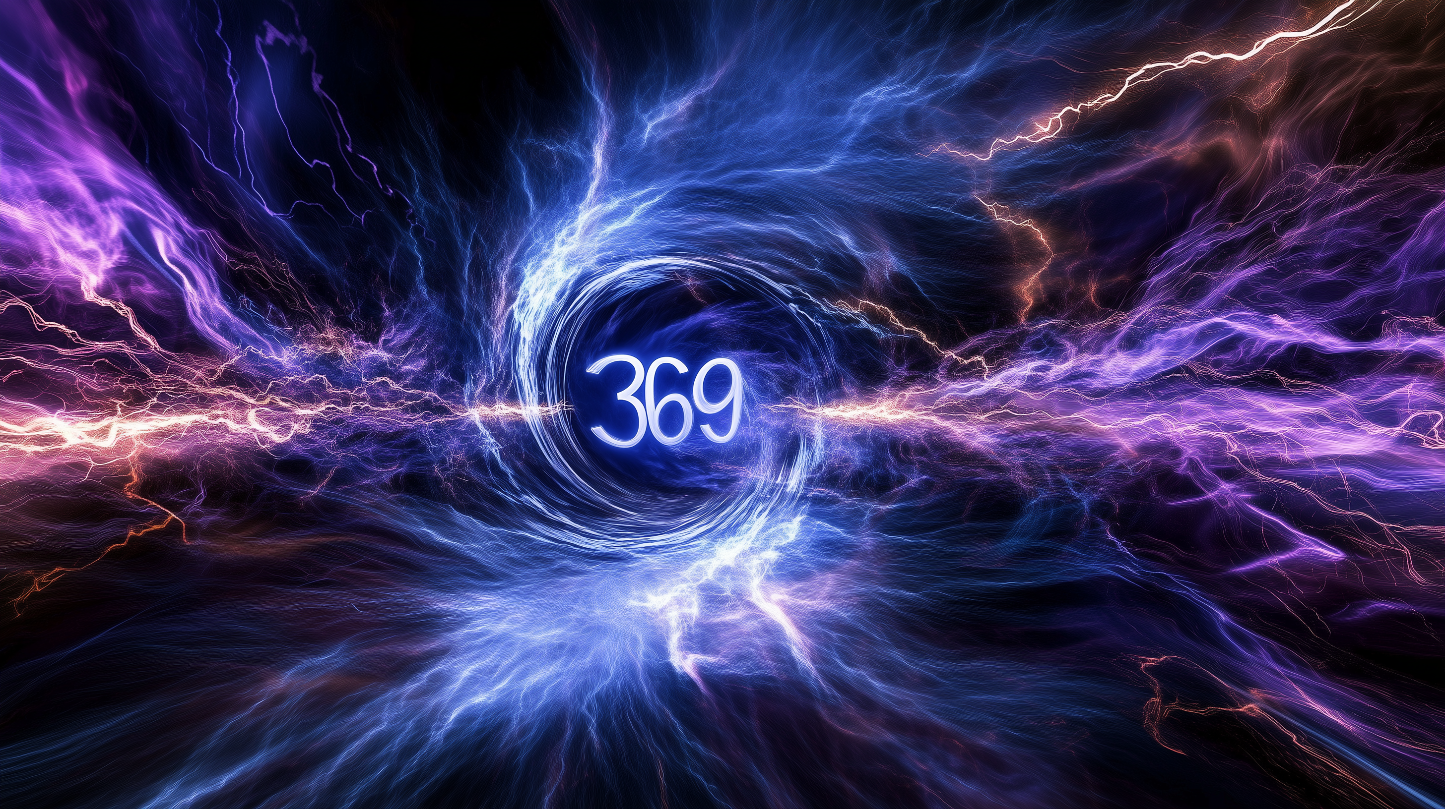 The image features the numbers 369 artistically surrounded by dynamic frequency waves and powerful lightning bolts. The overall composition creates a sense of energy and movement, evoking a feeling of vibrant creativity.