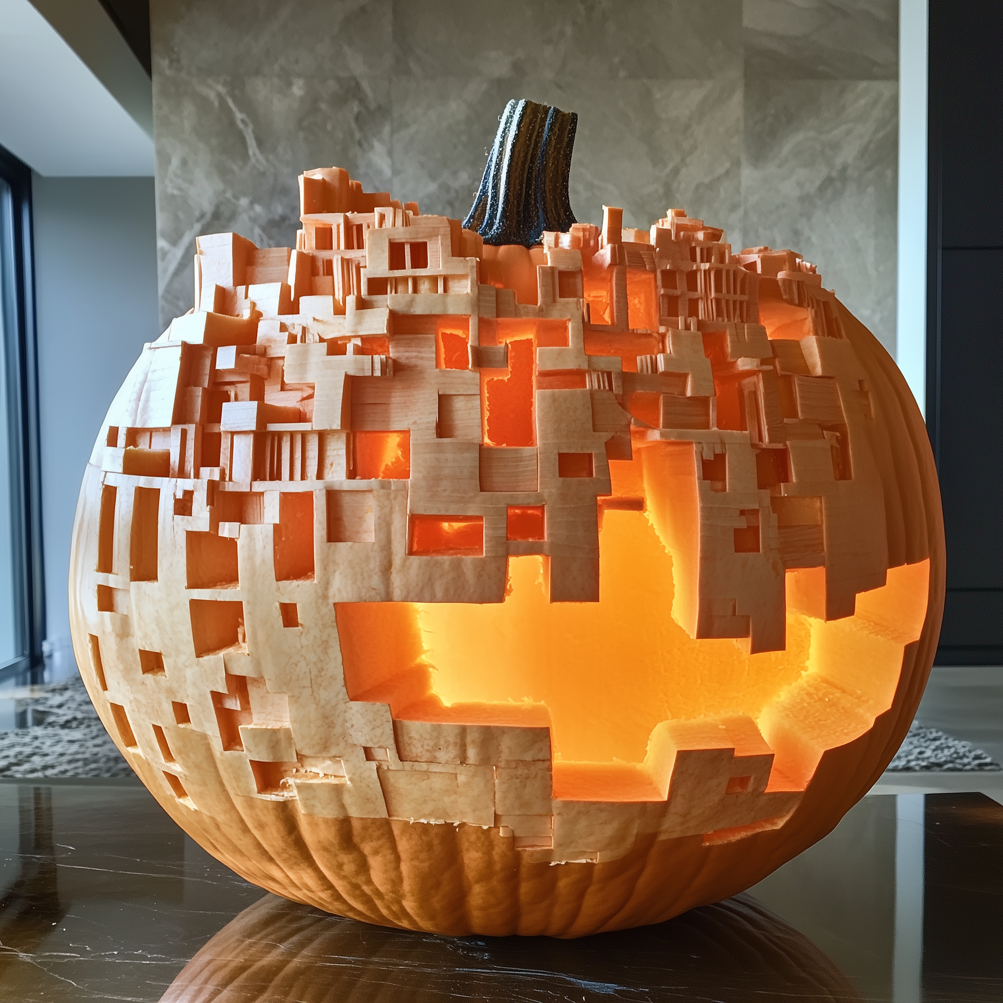 This illustration features a creatively designed pumpkin, showcasing a unique and modern architectural style. The vibrant colors and geometric shapes give it a contemporary feel, drawing the eye and sparking curiosity.