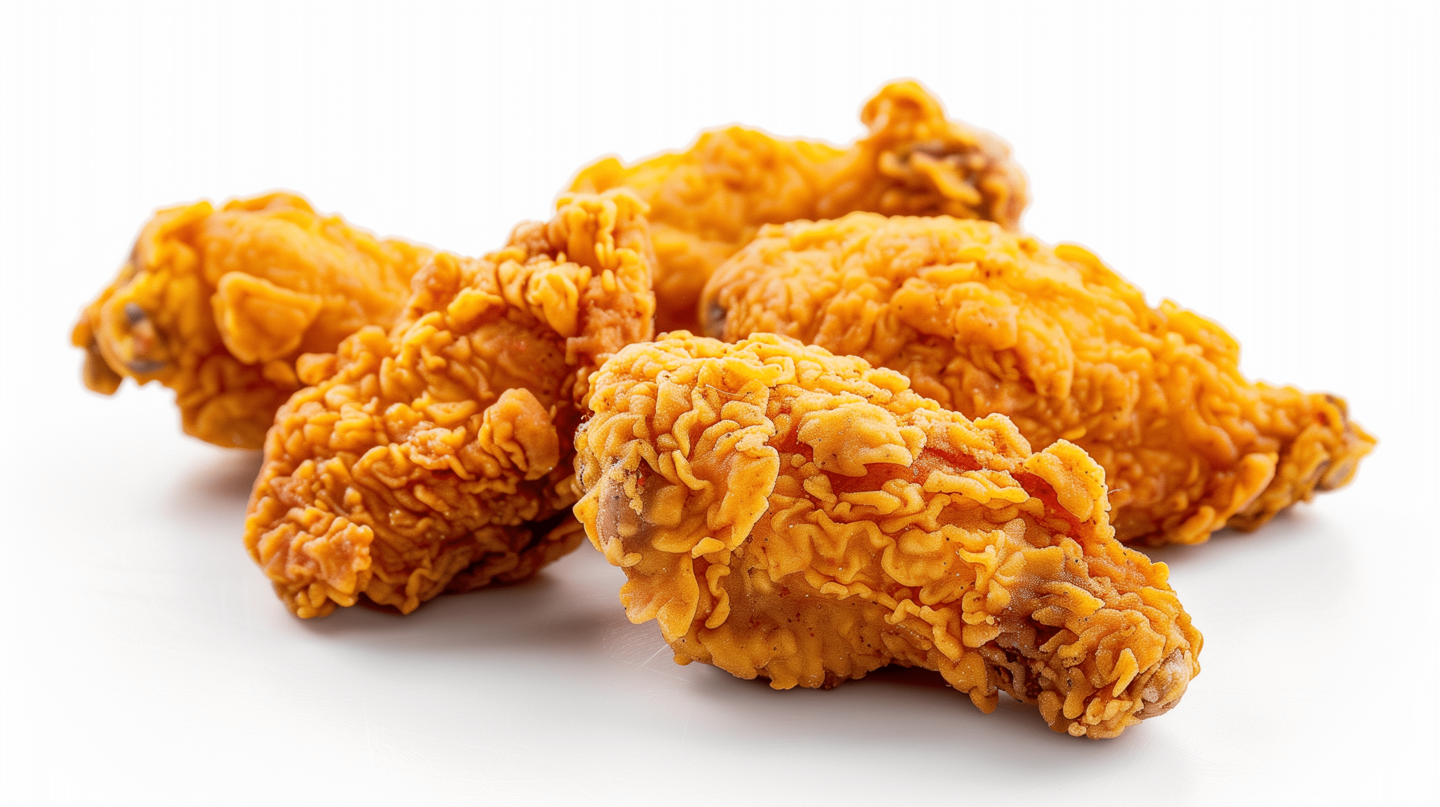 The image features five pieces of golden brown, spicy crispy fried chicken placed on a clean white background. The use of depth of field adds a pleasing focus to the delicious texture and color of the chicken, enhancing its appetizing appearance.