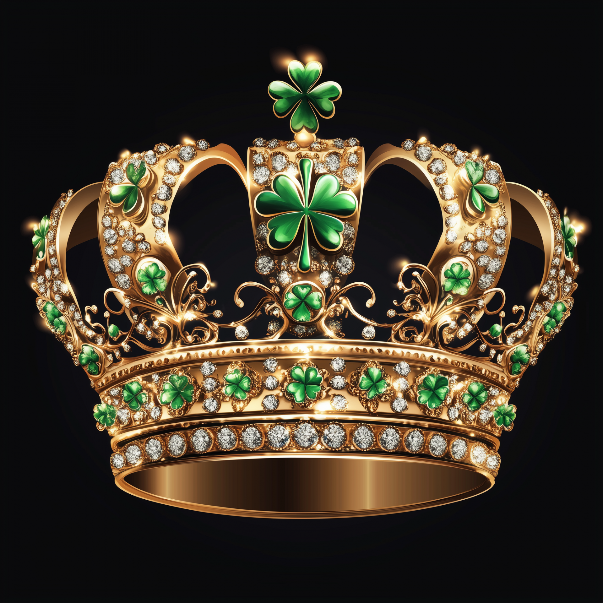 This illustration features a king's crown uniquely designed with vibrant shamrocks replacing traditional diamonds. The crown's artistic style adds a touch of whimsy and elegance, creating a captivating visual effect.